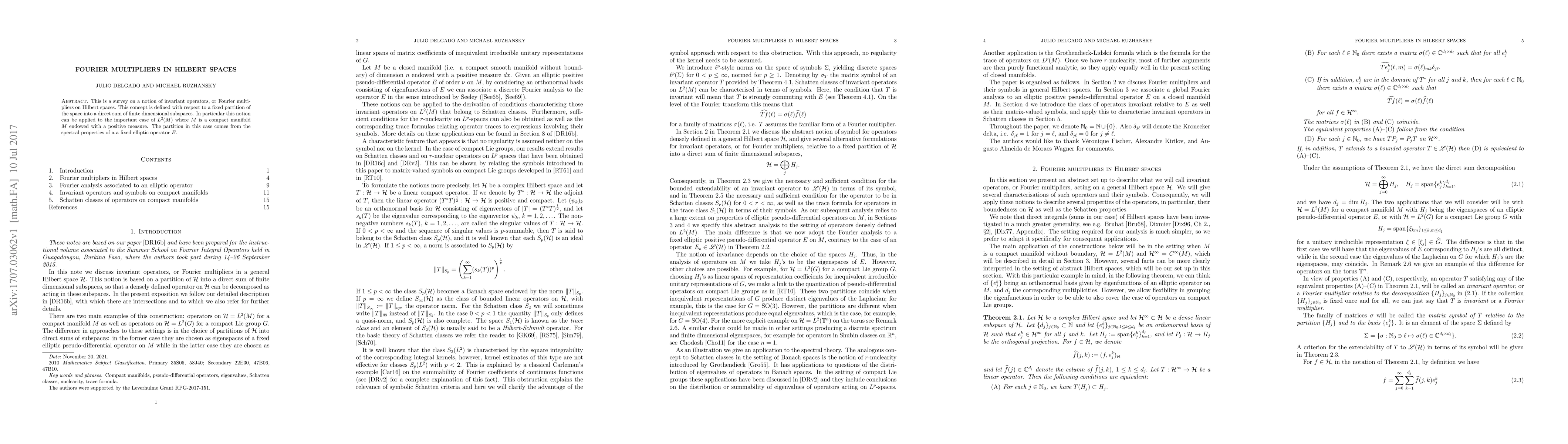 This paper surveys Fourier multipliers in Hilbert spaces, focusing on their application to compact manifolds with positive measure, and explores the spectral properties of fixed elliptic operators.