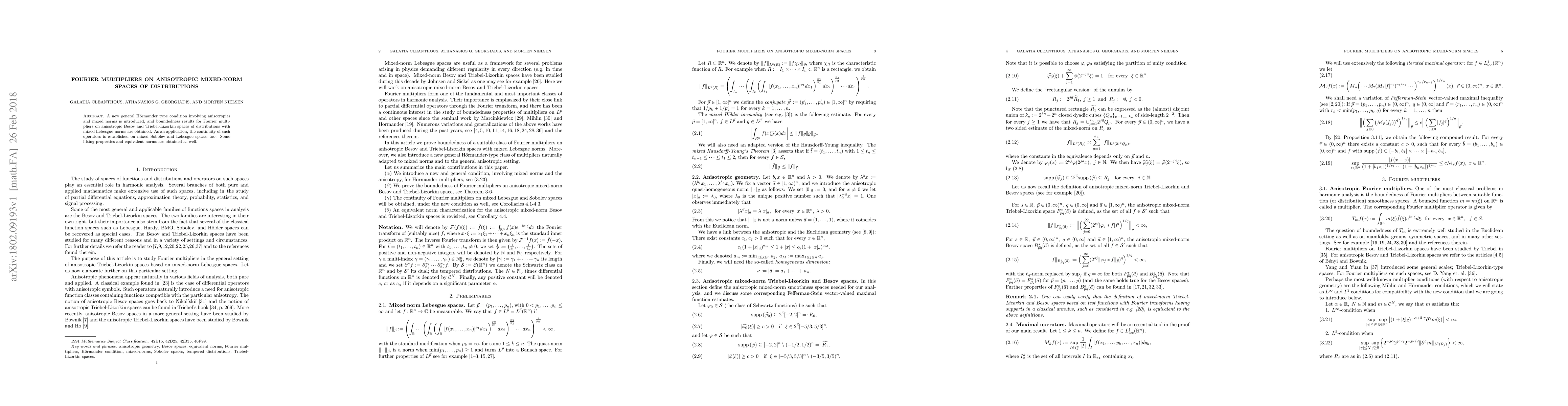 A new general Hormander type condition involving anisotropies and mixed norms is introduced, and boundedness results for Fourier multi- pliers on anisotropic Besov and Triebel-Lizorkin spaces of distributions with mixed Lebesgue norms are obtained. As an application, the continuity of such operators is established on mixed Sobolev and Lebesgue spaces too. Some lifting properties and equivalent norms are obtained as well.