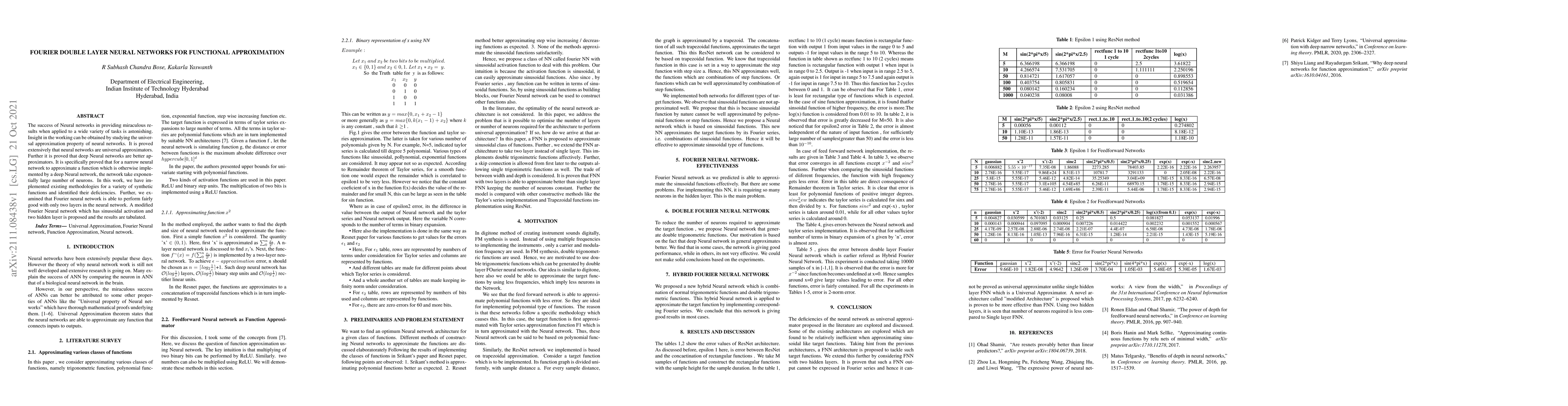 The success of Neural networks in providing miraculous results when applied to a wide variety of tasks is astonishing. Insight in the working can be obtained by studying the universal approximation property of neural networks. It is proved extensively that neural networks are universal approximators. Further it is proved that deep Neural networks are better approximators. It is specifically proved that for a narrow neural network to approximate a function which is otherwise implemented by a deep Neural network, the network take exponentially large number of neurons. In this work, we have implemented existing methodologies for a variety of synthetic functions and identified their deficiencies. Further, we examined that Fourier neural network is able to perform fairly good with only two layers in the neural network. A modified Fourier Neural network which has sinusoidal activation and two hidden layer is proposed and the results are tabulated.