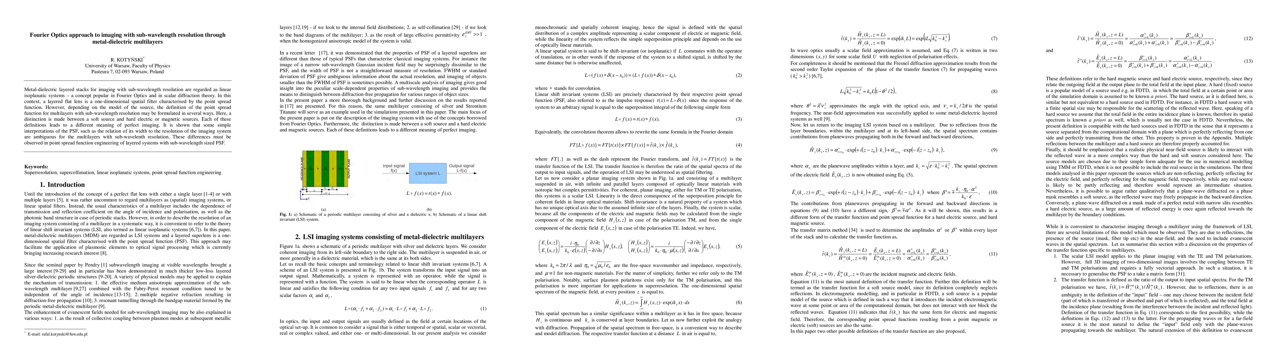 This paper explores the Fourier Optics approach to achieving sub-wavelength resolution in imaging through metal-dielectric multilayers, highlighting the complexities in defining the point spread function (PSF) depending on the nature of the source. It emphasizes that different interpretations of the PSF lead to varying definitions of perfect imaging, complicating the engineering of such layered systems.