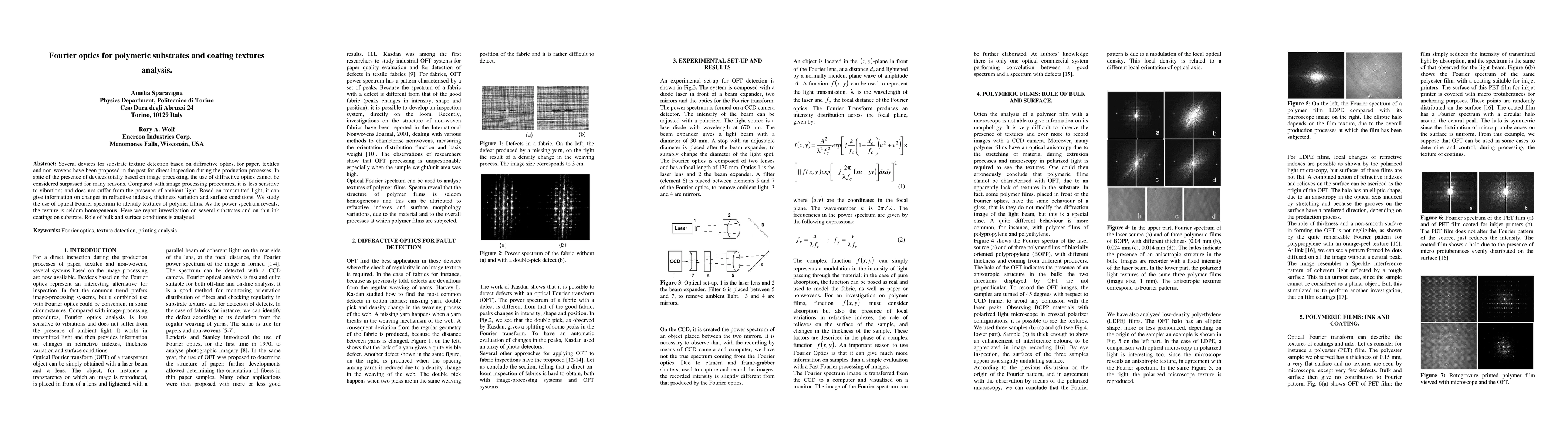 Several devices for substrate texture detection based on diffractive optics, for paper, textiles and non-wovens have been proposed in the past for direct inspection during the production processes. In spite of the presence of devices totally based on image processing, the use of diffractive optics cannot be considered surpassed for many reasons. Compared with image processing procedures, it is less sensitive to vibrations and does not suffer from the presence of ambient light. Based on transmitted light, it can give information on changes in refractive indexes, thickness variation and surface conditions. We study the use of optical Fourier spectrum to identify textures of polymer films. As the power spectrum reveals, the texture is seldom homogeneous. Here we report investigation on several substrates and on thin ink coatings on substrate. Role of bulk and surface conditions is analysed.