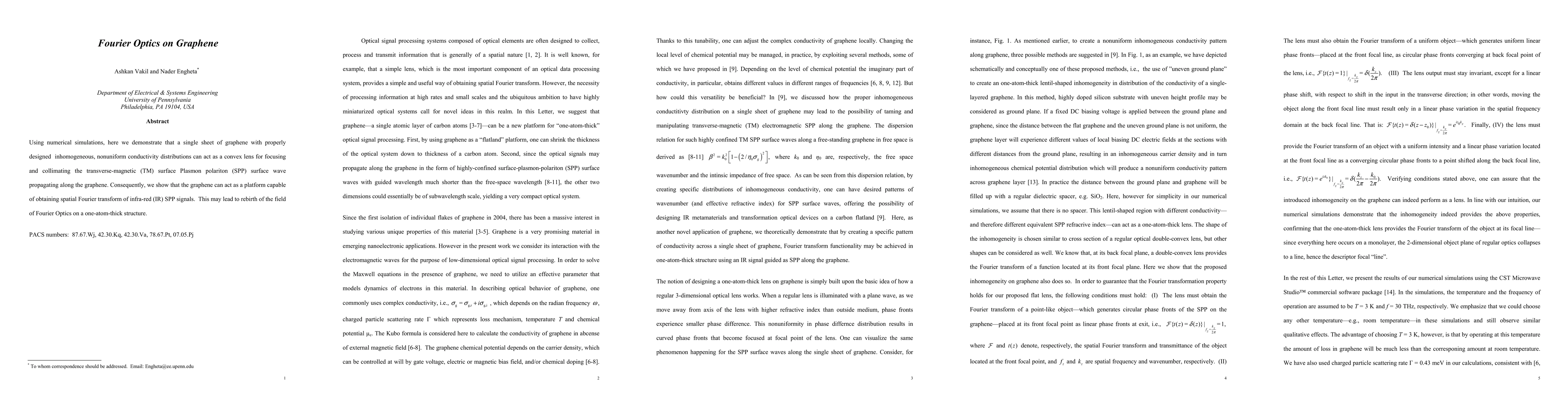 This paper demonstrates that graphene with tailored conductivity can focus and collimate TM SPPs, acting as a lens for IR SPP signals. The findings suggest graphene can perform spatial Fourier transforms, reviving the concept of Fourier optics on an atomic scale.