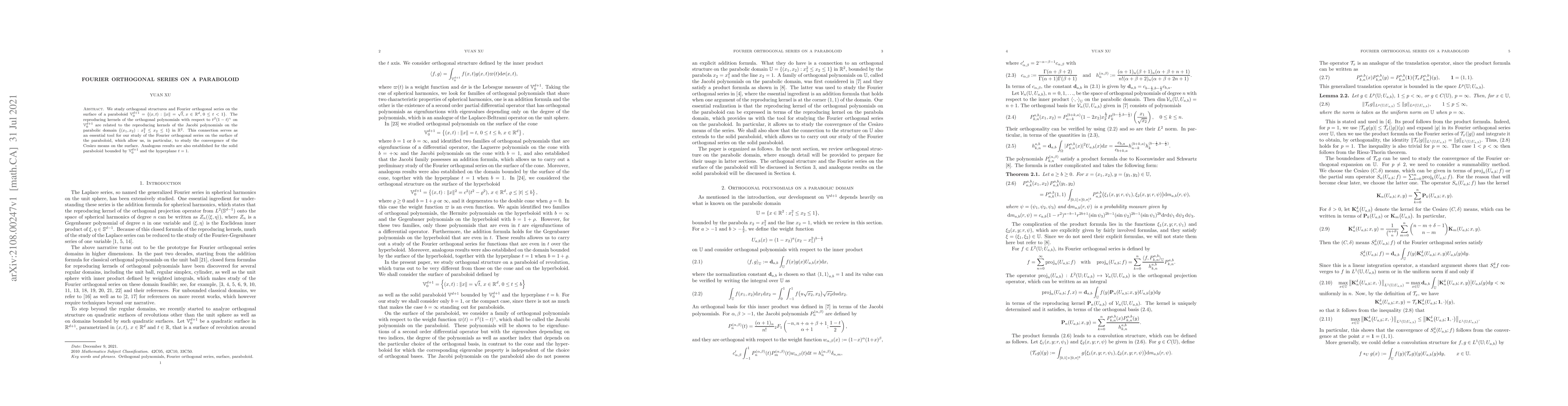 The paper presents a detailed analysis of reproducing kernels and Fourier orthogonal series on a paraboloid, linking them to Jacobi polynomials on a parabolic domain.