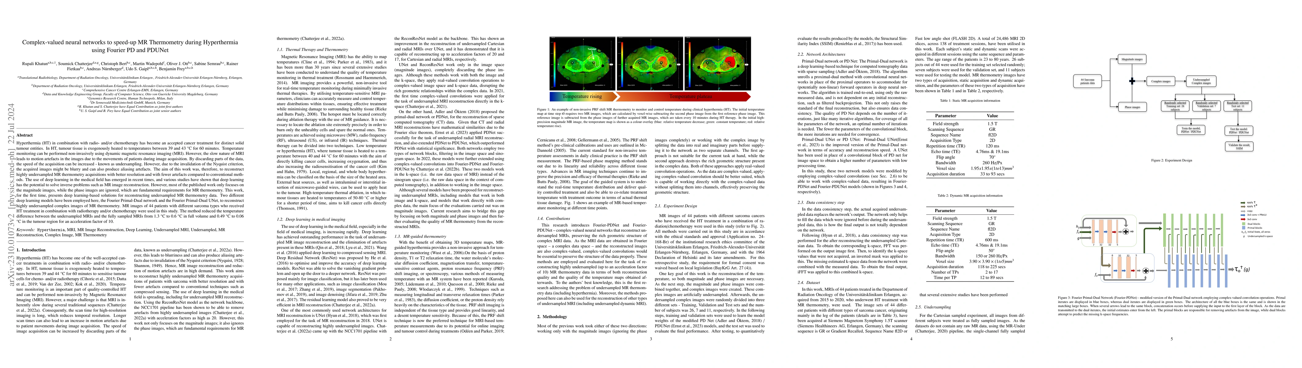 This paper introduces Fourier PD and PDUNet, complex-valued deep learning networks designed to reconstruct highly undersampled MRI thermometry data during hyperthermia treatment, achieving better resolution and fewer artefacts compared to conventional methods. The approach significantly reduces temperature measurement errors from 1.5°C to 0.5°C.
