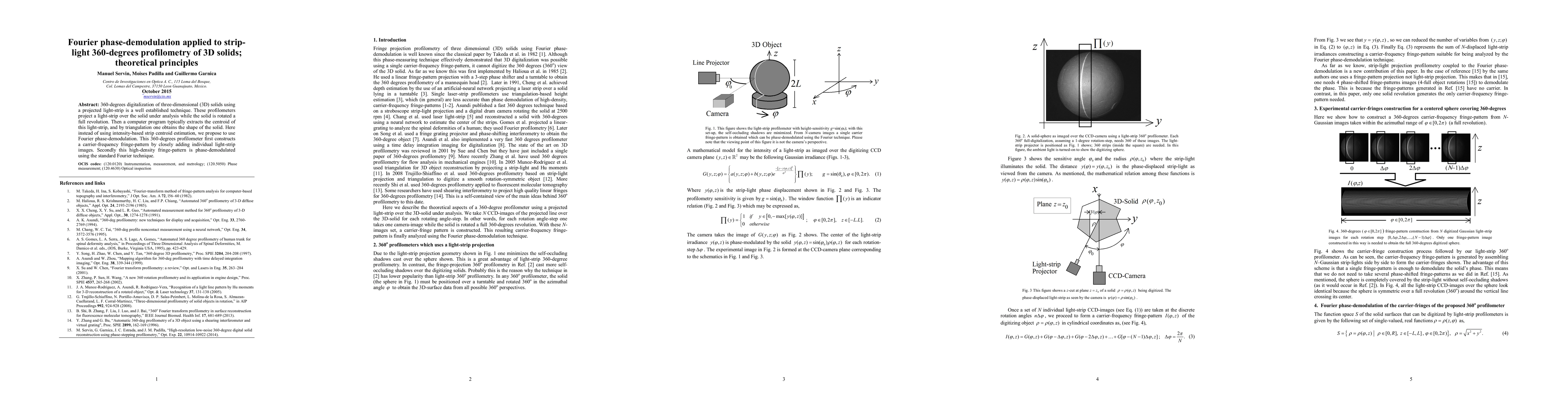 This paper proposes using Fourier phase-demodulation instead of intensity-based centroid estimation for 360-degrees strip-light profilometry of 3D solids. The method involves constructing a high-density fringe-pattern from individual light-strip images and applying Fourier phase-demodulation to extract the shape of the solid.