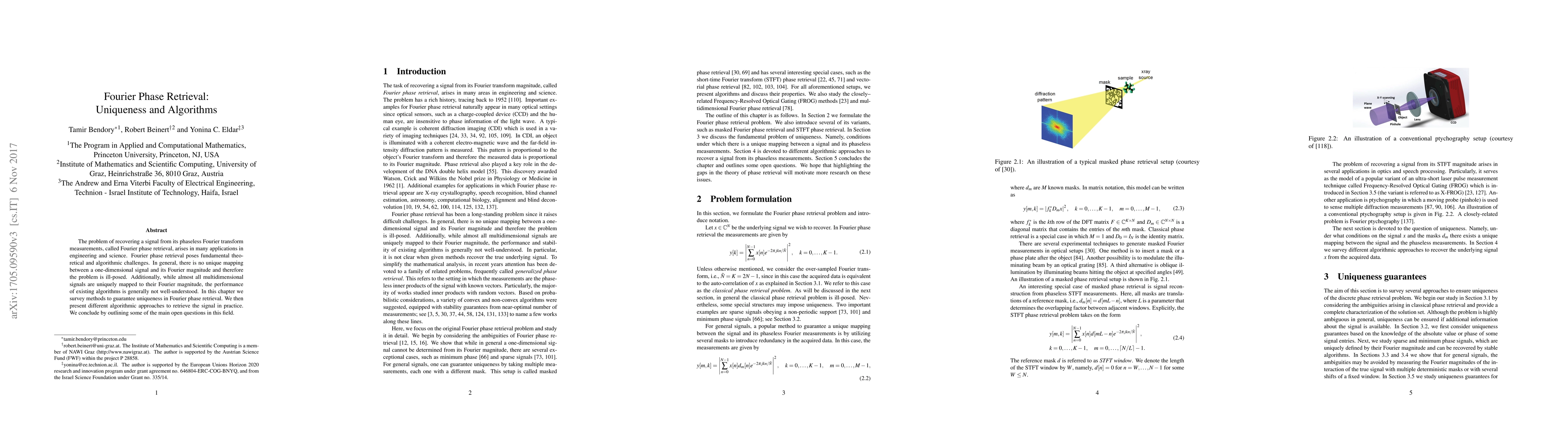 The problem of recovering a signal from its phaseless Fourier transform measurements, called Fourier phase retrieval, arises in many applications in engineering and science. Fourier phase retrieval poses fundamental theoretical and algorithmic challenges. In general, there is no unique mapping between a one-dimensional signal and its Fourier magnitude and therefore the problem is ill-posed. Additionally, while almost all multidimensional signals are uniquely mapped to their Fourier magnitude, the performance of existing algorithms is generally not well-understood. In this chapter we survey methods to guarantee uniqueness in Fourier phase retrieval. We then present different algorithmic approaches to retrieve the signal in practice. We conclude by outlining some of the main open questions in this field.