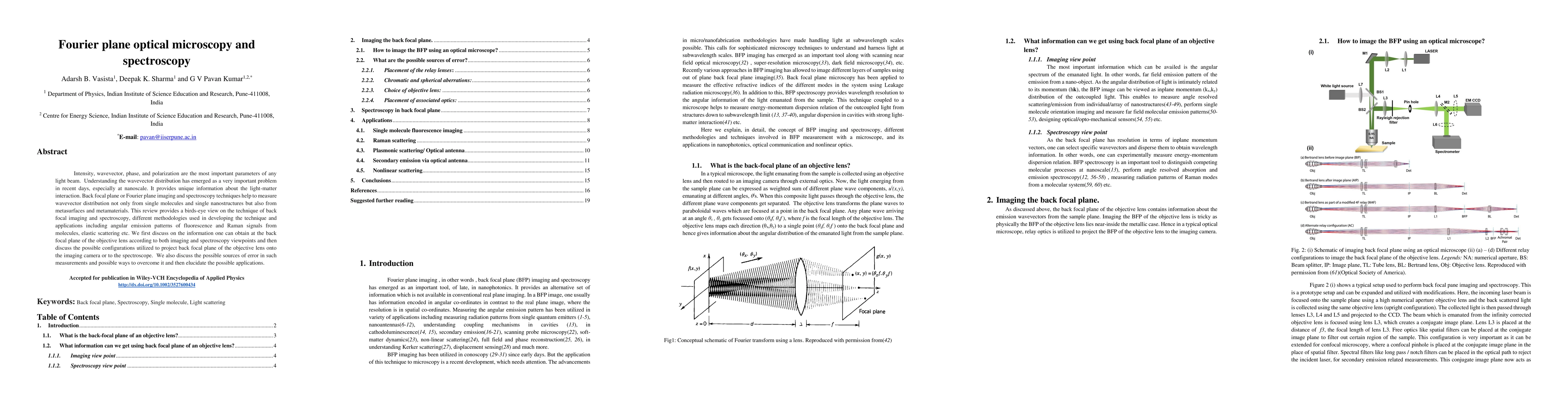Intensity, wavevector, phase, and polarization are the most important parameters of any light beam. Understanding the wavevector distribution has emerged as a very important problem in recent days, especially at nanoscale. It provides unique information about the light-matter interaction. Back focal plane or Fourier plane imaging and spectroscopy techniques help to measure wavevector distribution not only from single molecules and single nanostructures but also from metasurfaces and metamaterials. This review provides a birds-eye view on the technique of back focal imaging and spectroscopy, different methodologies used in developing the technique and applications including angular emission patterns of fluorescence and Raman signals from molecules, elastic scattering etc. We first discuss on the information one can obtain at the back focal plane of the objective lens according to both imaging and spectroscopy viewpoints and then discuss the possible configurations utilized to project back focal plane of the objective lens onto the imaging camera or to the spectroscope. We also discuss the possible sources of error in such measurements and possible ways to overcome it and then elucidate the possible applications.