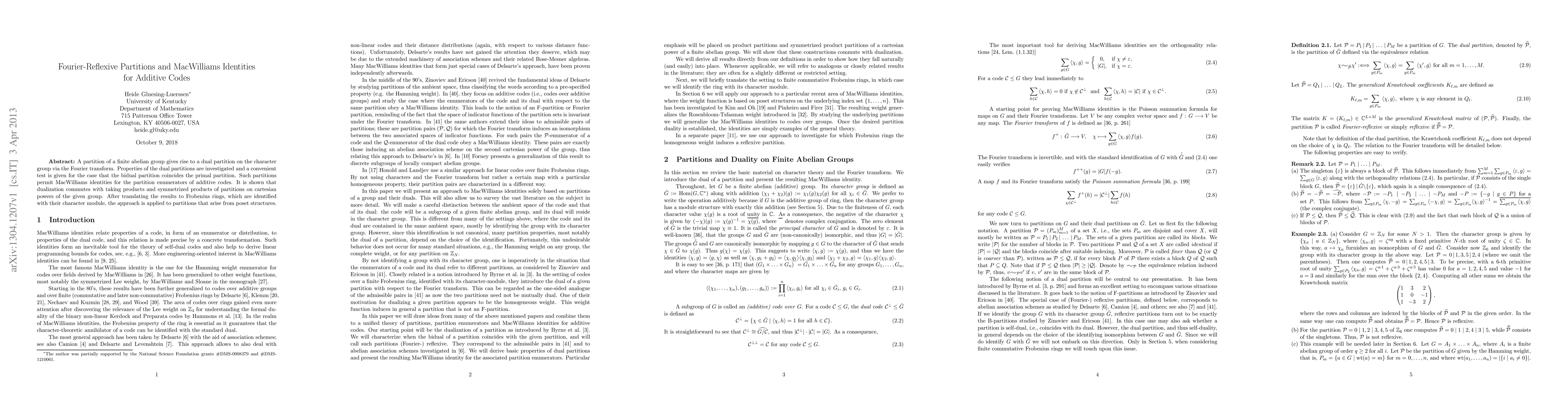 This paper explores Fourier-reflexive partitions in finite abelian groups and their duals, establishing conditions for bidual partitions to coincide with primal partitions. It demonstrates how these partitions enable MacWilliams identities for additive codes and shows that dualization commutes with products and symmetrized products of partitions. The results are translated to Frobenius rings and applied to partitions derived from poset structures.