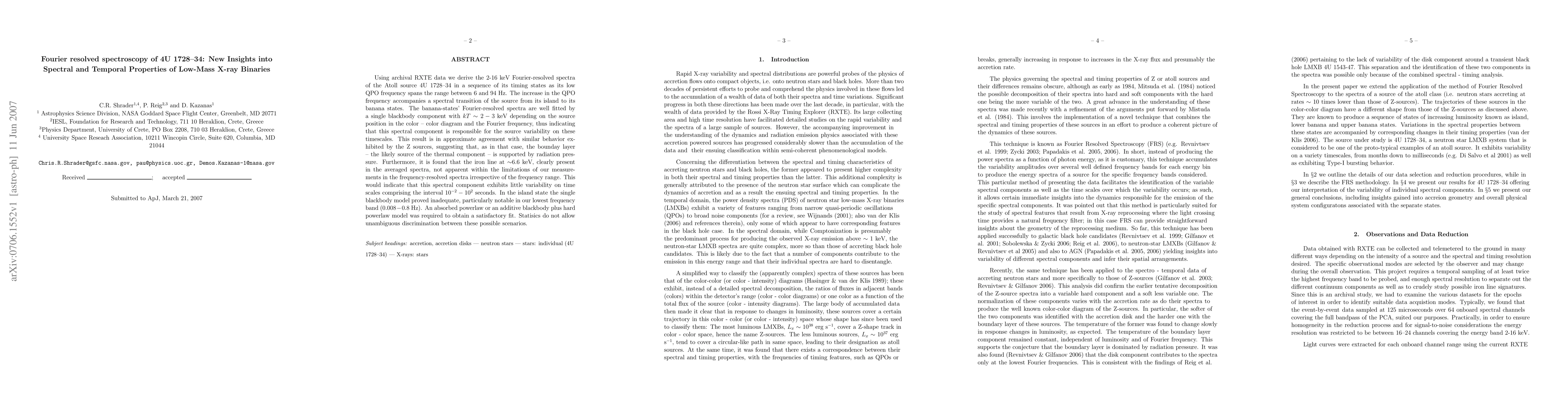 Using archival RXTE data we derive the 2-16 keV Fourier-resolved spectra of the Atoll source 4U 1728-34 in a sequence of its timing states as its low QPO frequency spans the range between 6 and 94 Hz. The increase in the QPO frequency accompanies a spectral transition of the source from its island to its banana states. The banana-states' Fourier-resolved spectra are well fitted by a single blackbody component with $kT \sim 2-3$ keV depending on the source position in the color -- color diagram and the Fourier frequency, thus indicating that this spectral component is responsible for the source variability on these timescales. This result is in approximate agreement with similar behavior exhibited by the Z sources, suggesting that, as in that case, the boundary layer -- the likely source of the thermal component -- is supported by radiation pressure. Furthermore, it is found that the iron line at $\sim$6.6 keV, clearly present in the averaged spectra, not apparent within the limitations of our measurements in the frequency-resolved spectra irrespective of the frequency range. This would indicate that this spectral component exhibits little variability on time scales comprising the interval $10^{-2}-10^2$ seconds. In the island state the single blackbody model proved inadequate, particularly notable in our lowest frequency band ($0.008-0.8$ Hz). An absorbed powerlaw or an additive blackbody plus hard powerlaw model was required to obtain a satisfactory fit. Statistics do not allow unambiguous discrimination between these possible scenarios.
