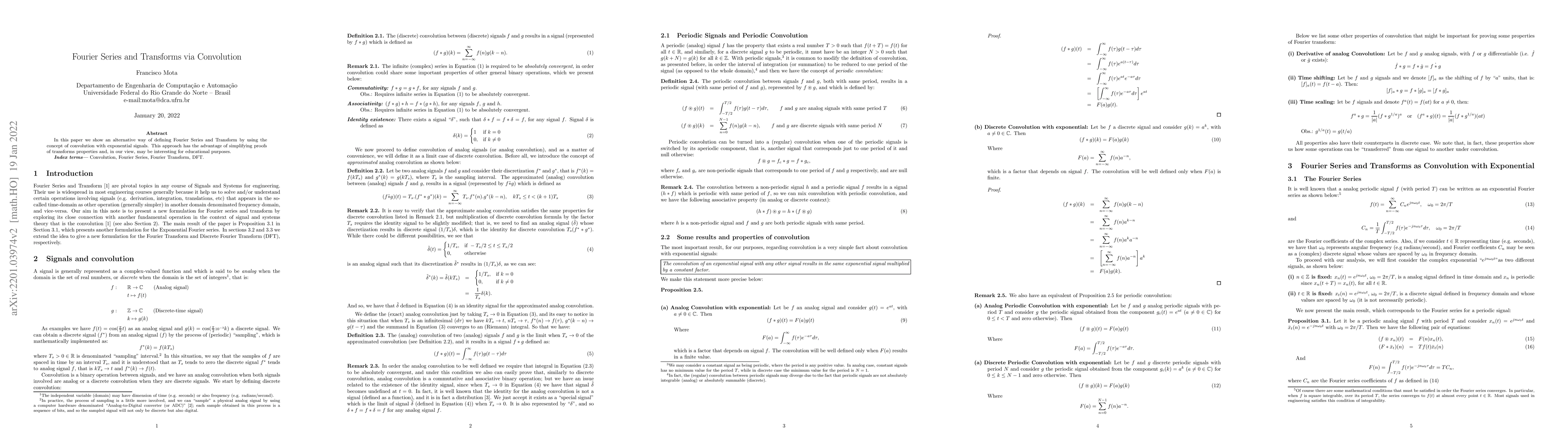 This paper presents an alternative method for defining Fourier Series and Transforms through convolution with exponential signals, simplifying proofs of transform properties and potentially enhancing educational clarity.