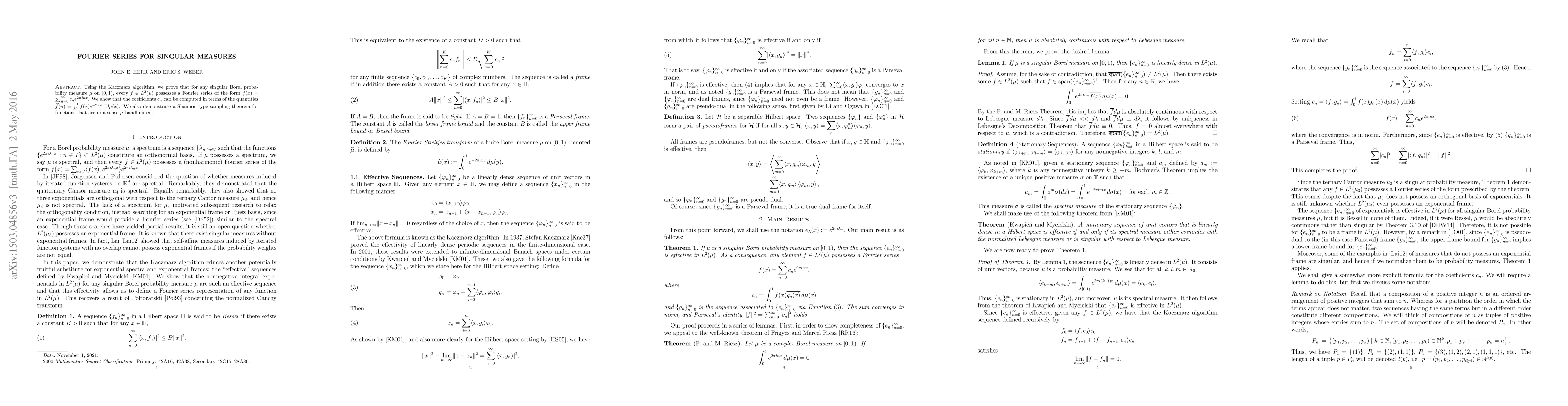 This paper proves that singular Borel probability measures on $[0,1)$ allow $L^2(\mu)$ functions to have Fourier series representations using the Kaczmarz algorithm. It also establishes a method for computing Fourier coefficients in terms of $\mu$-bandlimited integrals.