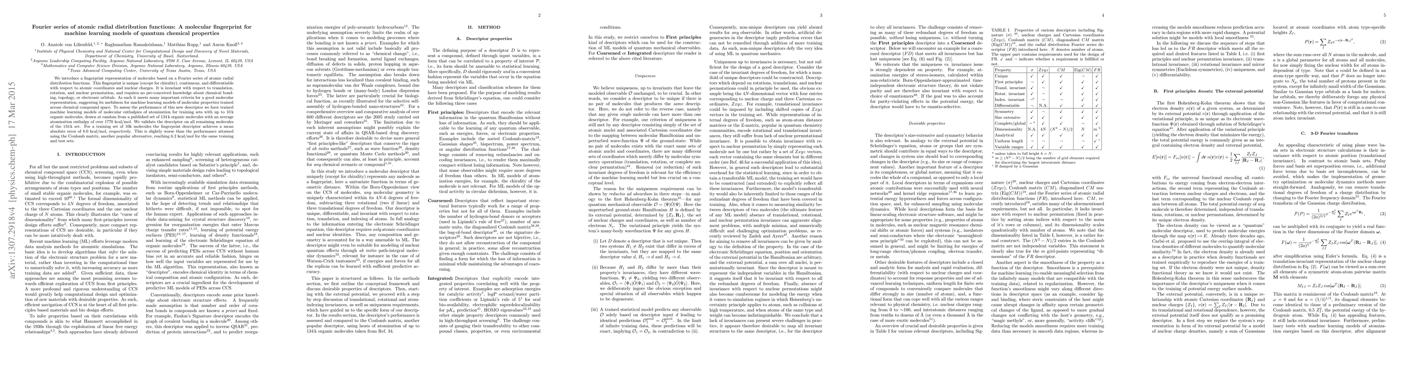 This paper proposes a novel molecular fingerprint based on Fourier series of atomic radial distribution functions, which is invariant to molecular transformations and requires no prior knowledge of chemical bonding. The descriptor is evaluated for machine learning models predicting molecular enthalpies of atomization, achieving a mean absolute error of 8.0 kcal/mol, slightly worse than the Coulomb matrix approach.