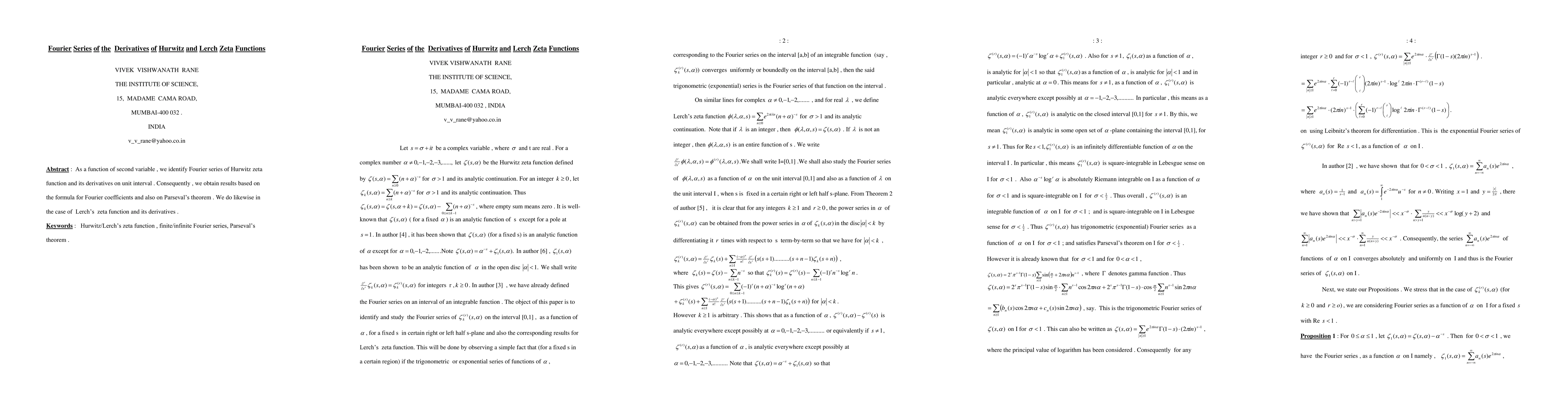 This research identifies the Fourier series of the derivatives of Hurwitz and Lerch zeta functions on the unit interval and derives results using Fourier coefficients and Parseval's theorem.
