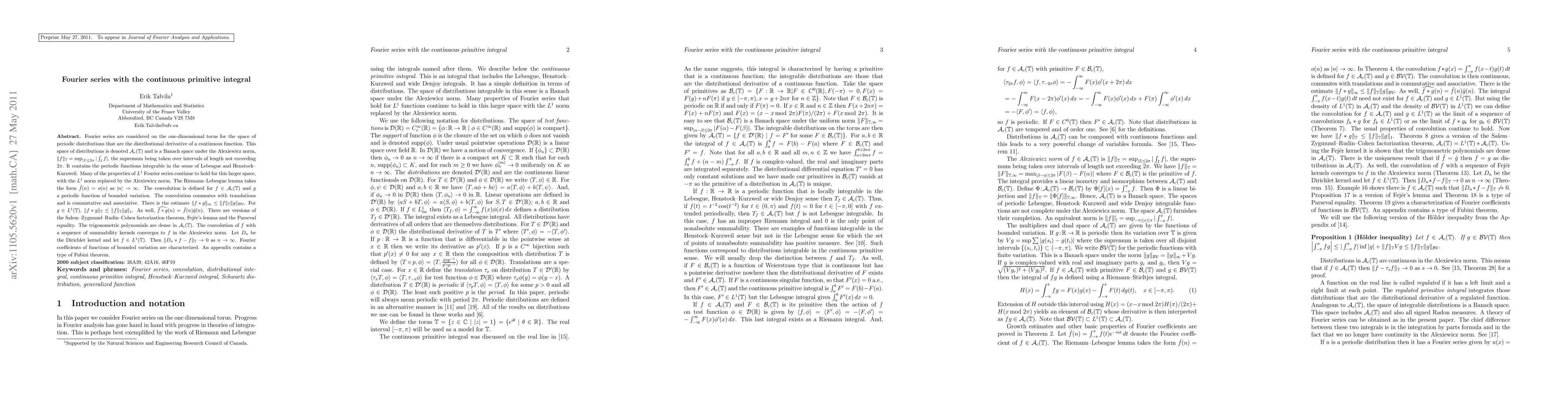 Fourier series are considered on the one-dimensional torus for the space of periodic distributions that are the distributional derivative of a continuous function. This space of distributions is denoted $\alext$ and is a Banach space under the Alexiewicz norm, $\|f\|_\T =\sup_{|I|\leq 2\pi}|\int_I f|$, the supremum being taken over intervals of length not exceeding $2\pi$. It contains the periodic functions integrable in the sense of Lebesgue and Henstock-Kurzweil. Many of the properties of $L^1$ Fourier series continue to hold for this larger space, with the $L^1$ norm replaced by the Alexiewicz norm. The Riemann-Lebesgue lemma takes the form $\fhat(n)=o(n)$ as $|n|\to\infty$. The convolution is defined for $f\in\alext$ and $g$ a periodic function of bounded variation. The convolution commutes with translations and is commutative and associative. There is the estimate $\|f\ast g\|_\infty\leq \|f\|_\T \|g\|_\bv$. For $g\in L^1(\T)$, $\|f\ast g\|_\T\leq \|f\|_\T \|g\|_1$. As well, $\widehat{f\ast g}(n)=\fhatn \hat{g}(n)$. There are versions of the Salem-Zygmund-Rudin-Cohen factorization theorem, Fej\'er's lemma and the Parseval equality. The trigonometric polynomials are dense in $\alext$. The convolution of $f$ with a sequence of summability kernels converges to $f$ in the Alexiewicz norm. Let $D_n$ be the Dirichlet kernel and let $f\in L^1(\T)$. Then $\|D_n\ast f-f\|_\T\to 0$ as $n\to\infty$. Fourier coefficients of functions of bounded variation are characterized. An appendix contains a type of Fubini theorem.
