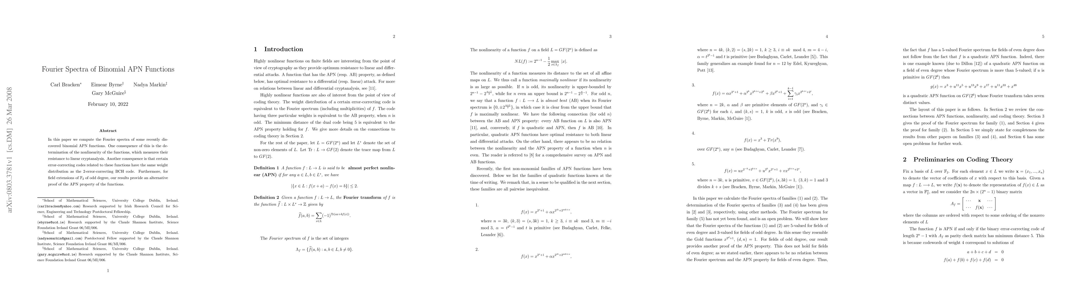 This paper computes the Fourier spectra of recently discovered binomial APN functions, determining their nonlinearity and proving their APN property for odd field degrees, while also linking their weight distribution to 2-error-correcting BCH codes.