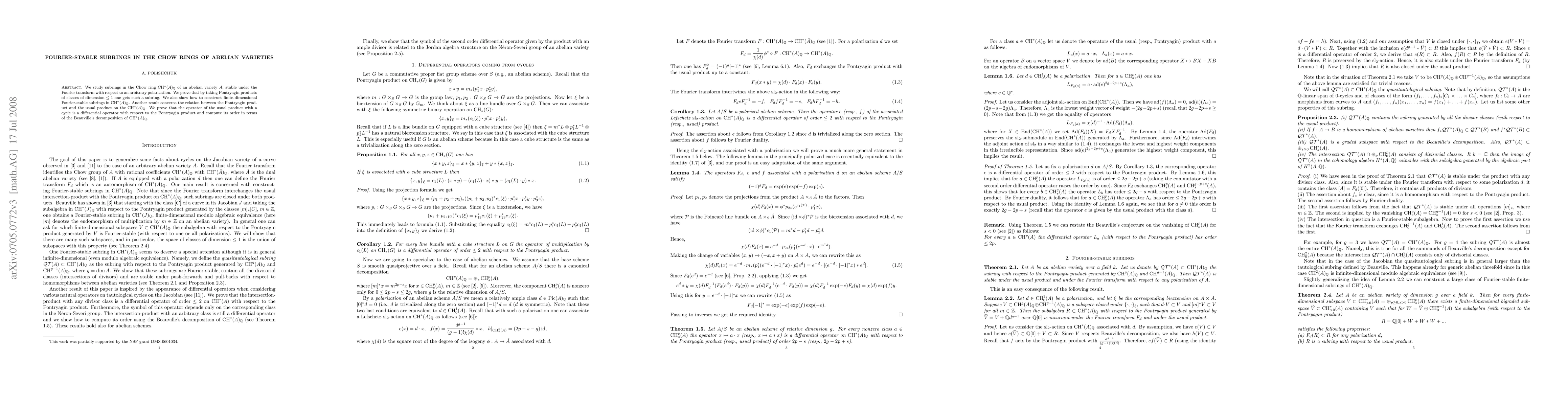 This research explores Fourier-stable subrings within the Chow rings of abelian varieties, stable under the Fourier transform relative to any polarization. It demonstrates that Pontryagin products of classes of dimension ≤1 form such a subring and provides methods for constructing finite-dimensional Fourier-stable subrings. Additionally, it establishes a relationship between the usual product and Pontryagin product, proving the former is a differential operator with respect to the latter and computing its order using Beauville's decomposition.