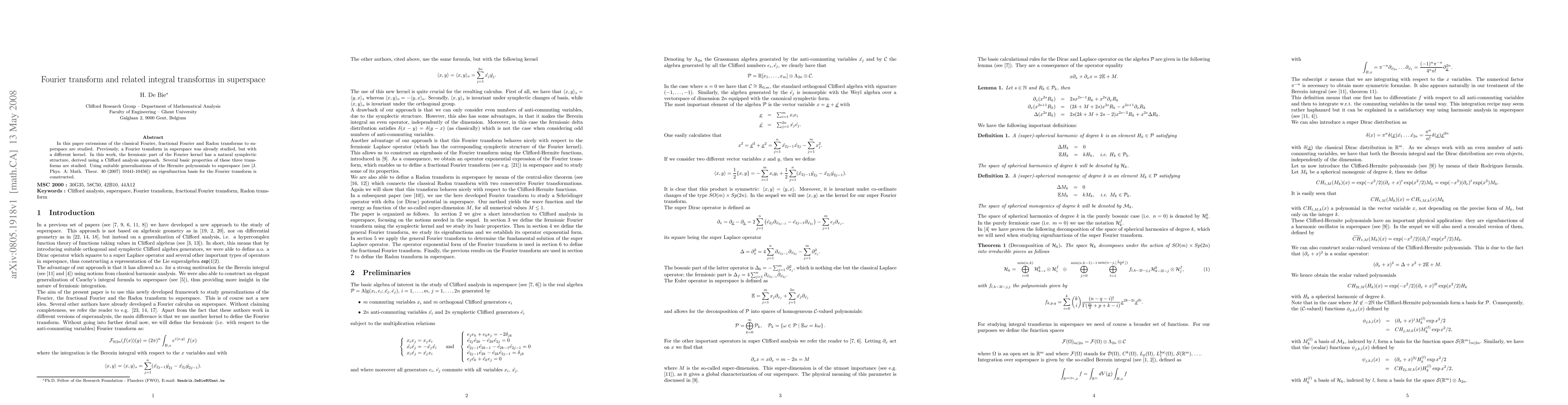 This paper extends classical Fourier, fractional Fourier, and Radon transforms to superspace, employing a symplectic structure for the fermionic part of the Fourier kernel derived via Clifford analysis. It constructs an eigenfunction basis for the Fourier transform using generalized Hermite polynomials in superspace.