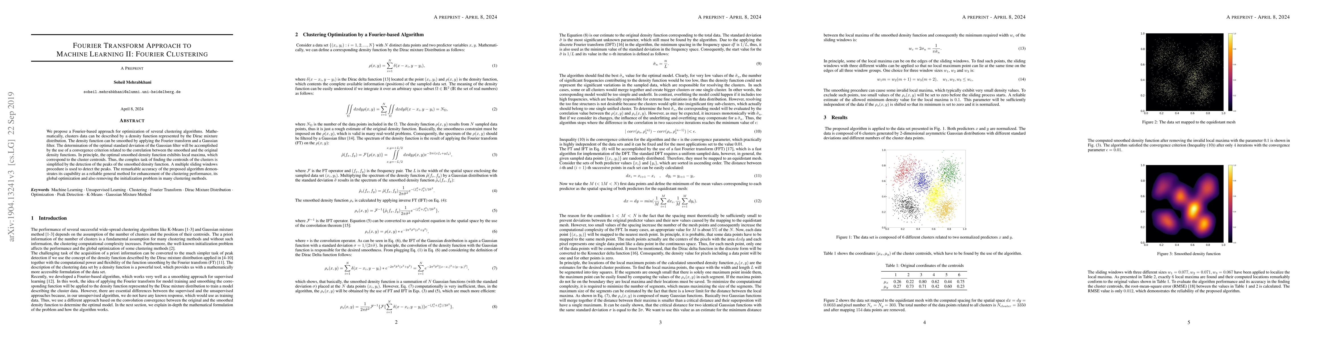 A new method for clustering data using Fourier transforms improves accuracy and resolves initialization issues in traditional clustering algorithms. It achieves this by smoothing the density function of clusters and detecting local maxima to find centroids.