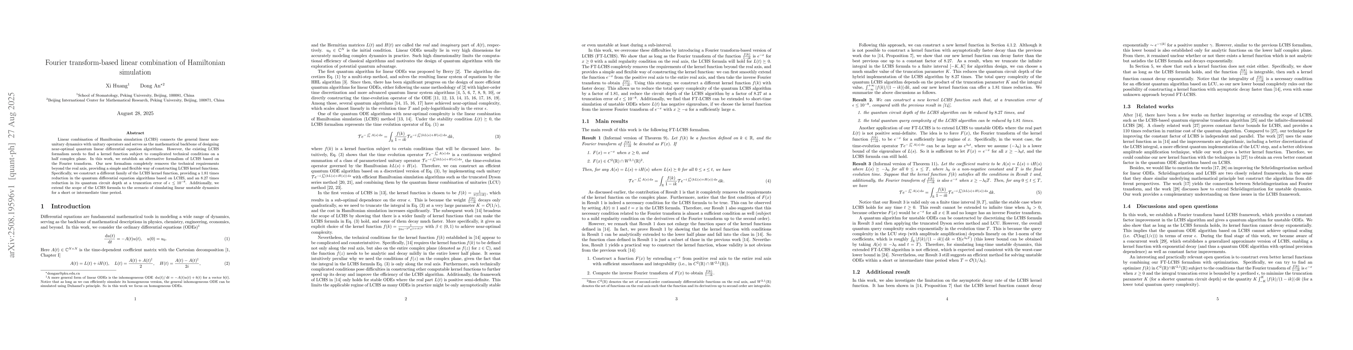 Linear combination of Hamiltonian simulation (LCHS) connects the general linear non-unitary dynamics with unitary operators and serves as the mathematical backbone of designing near-optimal quantum linear differential equation algorithms. However, the existing LCHS formalism needs to find a kernel function subject to complicated technical conditions on a half complex plane. In this work, we establish an alternative formalism of LCHS based on the Fourier transform. Our new formalism completely removes the technical requirements beyond the real axis, providing a simple and flexible way of constructing LCHS kernel functions. Specifically, we construct a different family of the LCHS kernel function, providing a $1.81$ times reduction in the quantum differential equation algorithms based on LCHS, and an $8.27$ times reduction in its quantum circuit depth at a truncation error of $\epsilon \le 10^{-8}$. Additionally, we extend the scope of the LCHS formula to the scenario of simulating linear unstable dynamics for a short or intermediate time period.
