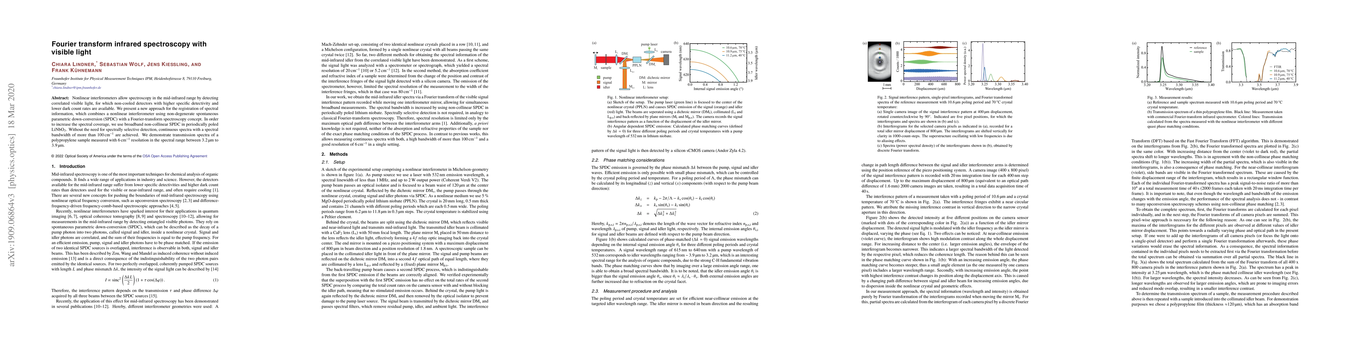 This paper introduces a novel Fourier transform infrared spectroscopy technique using visible light and nonlinear interferometry, achieving continuous spectra with high resolution and broad bandwidth without the need for spectrally selective detection. The method employs non-collinear SPDC in periodically poled LiNbO$_3$ to measure transmission spectra of polypropylene with high precision.