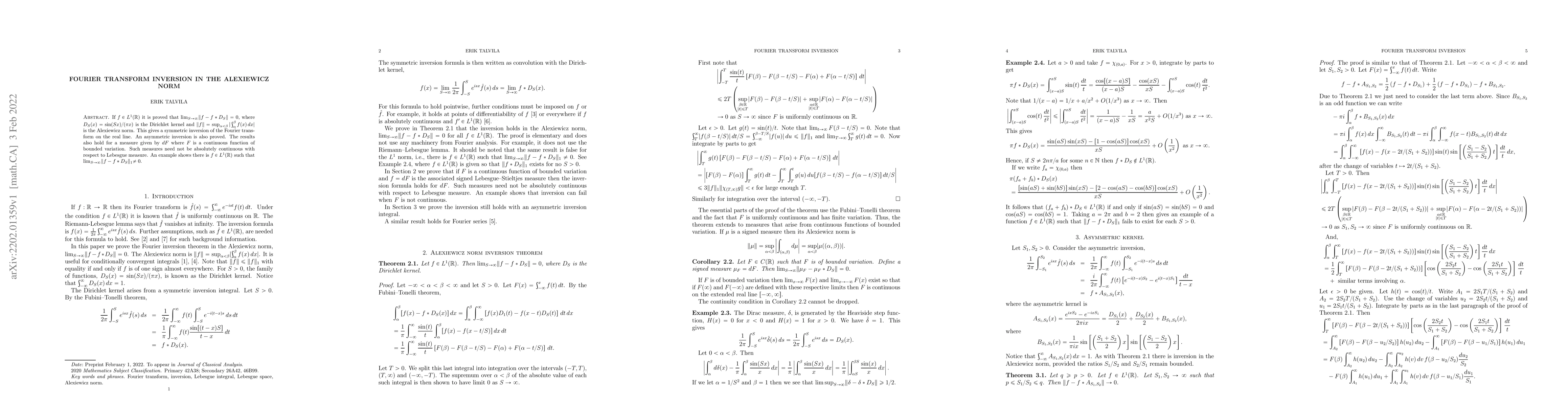 If $f\in L^1({\mathbb R})$ it is proved that $\lim_{S\to\infty}\lVert f-f\ast D_S\rVert=0$, where $D_S(x)=\sin(Sx)/(\pi x)$ is the Dirichlet kernel and $\lVert f\rVert = \sup_{\alpha<\beta}|\int_{\alpha}^{\beta}f(x)\,dx|$ is the Alexiewicz norm. This gives a symmetric inversion of the Fourier transform on the real line. An asymmetric inversion is also proved. The results also hold for a measure given by $dF$ where $F$ is a continuous function of bounded variation. Such measures need not be absolutely continuous with respect to Lebesgue measure. An example shows there is $f\in L^1({\mathbb R})$ such that $\lim_{S\to\infty} \rVert f-f\ast D_S\lVert_1\neq 0$.