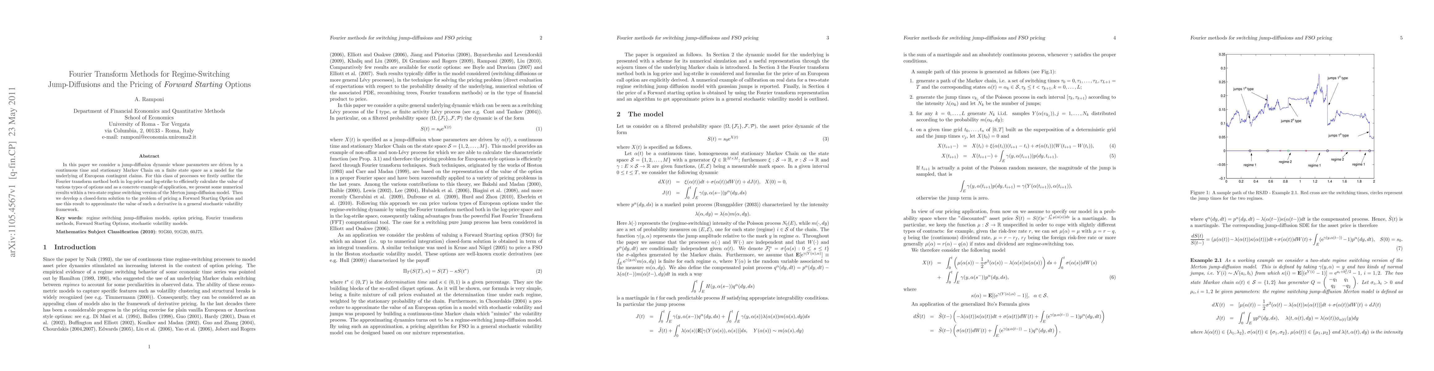 This paper develops Fourier transform methods for pricing options in a regime-switching jump-diffusion model, specifically applying it to a two-state version of the Merton model. It presents a closed-form solution for pricing Forward Starting Options within a stochastic volatility framework.