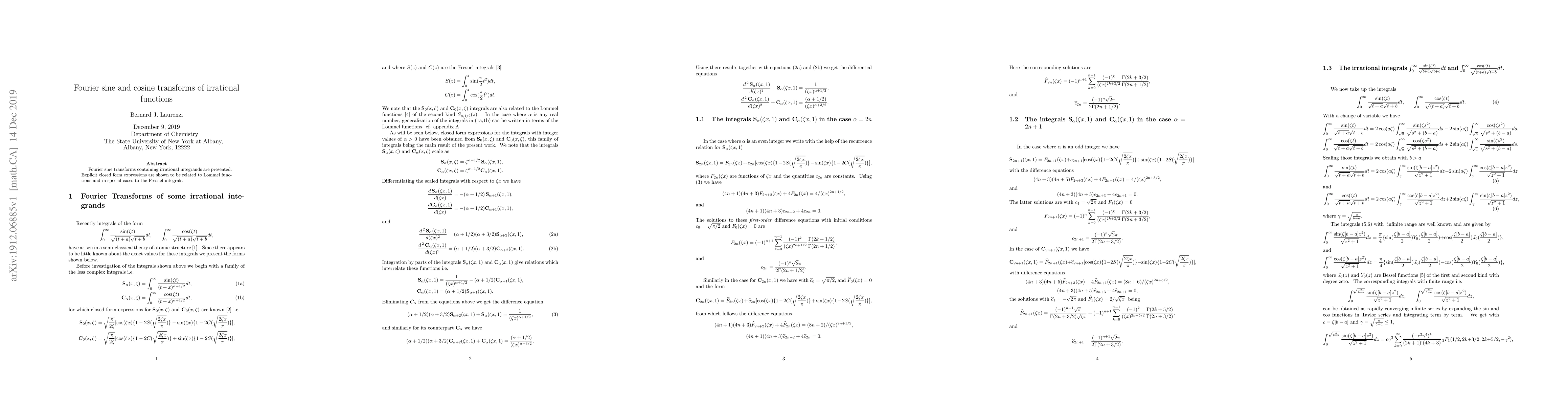 Fourier sine transforms containing irrational integrands are presented. Explicit closed form expressions are shown to be related to Lommel functions and in special cases to the Fresnel integrals. Such integrals arise in the semi-classical theory of the Chemical Potential of the atomic elements.