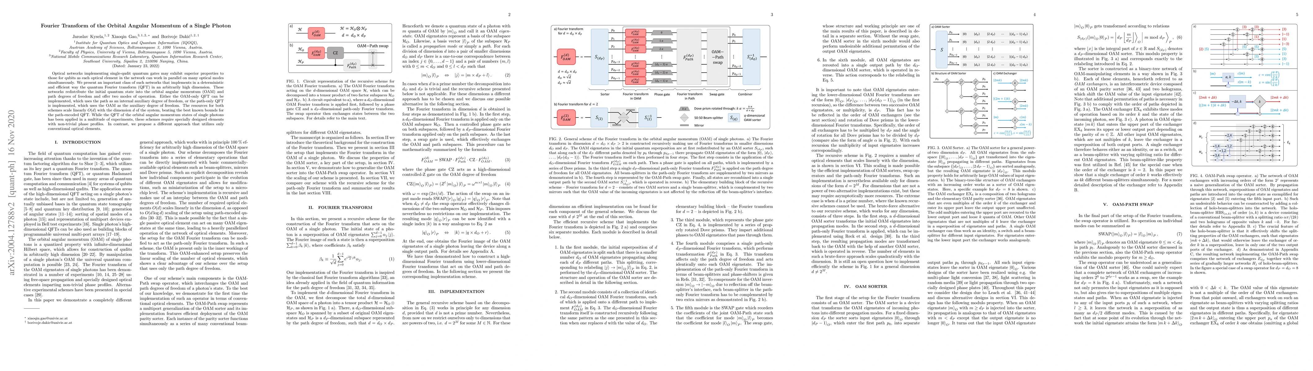 This paper proposes a novel optical network for quantum computation that efficiently implements the quantum Fourier transform in high dimensions using the orbital angular momentum of single photons, utilizing conventional optical elements instead of specially designed components. The network scales linearly with system dimension, outperforming existing path-encoded methods.