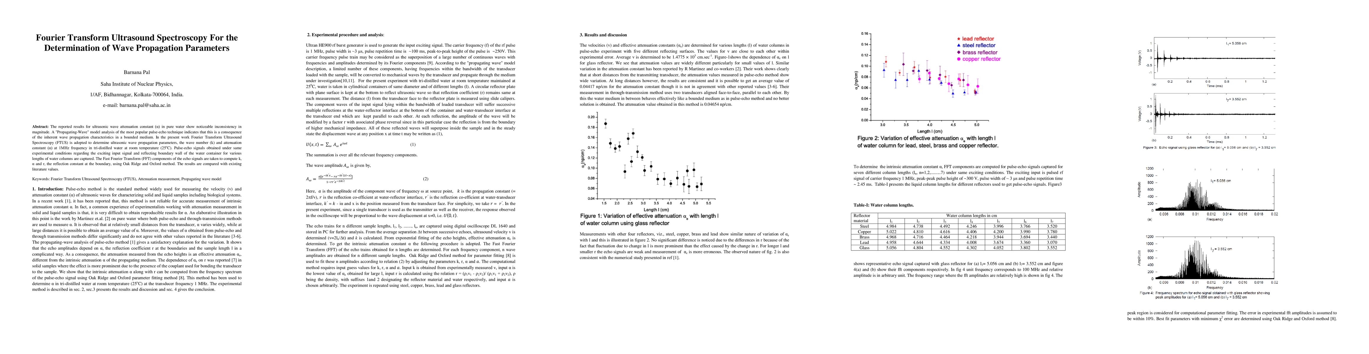 This paper employs Fourier Transform Ultrasound Spectroscopy (FTUS) to accurately determine ultrasonic wave propagation parameters, including wave number (k) and attenuation constant (α), in tri-distilled water at 1 MHz and 25°C. The study resolves inconsistencies in previous measurements by analyzing pulse-echo signals using the Fast Fourier Transform (FFT) and comparing results with existing literature.