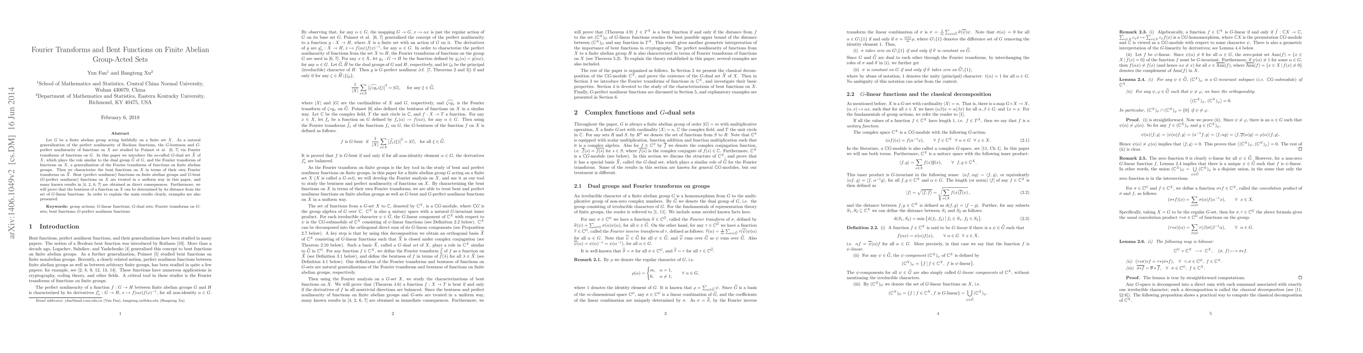 This paper generalizes the concept of bent functions from Boolean functions to functions on finite abelian group-acted sets, introducing $G$-dual sets and $G$-Fourier transforms. It characterizes bent functions on such sets in terms of their $G$-Fourier transforms and establishes results on their bentness based on their distance from $G$-linear functions, unifying previous findings.