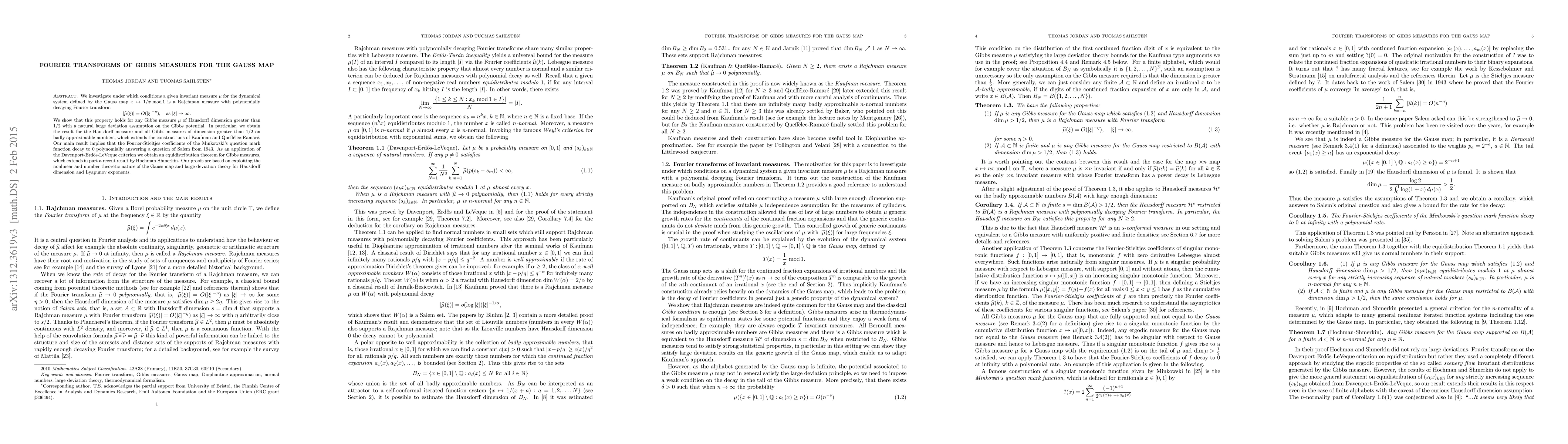 We investigate under which conditions a given invariant measure $\mu$ for the dynamical system defined by the Gauss map $x \mapsto 1/x \mod 1$ is a Rajchman measure with polynomially decaying Fourier transform $$|\widehat{\mu}(\xi)| = O(|\xi|^{-\eta}), \quad \text{as } |\xi| \to \infty.$$ We show that this property holds for any Gibbs measure $\mu$ of Hausdorff dimension greater than $1/2$ with a natural large deviation assumption on the Gibbs potential. In particular, we obtain the result for the Hausdorff measure and all Gibbs measures of dimension greater than $1/2$ on badly approximable numbers, which extends the constructions of Kaufman and Queff\'elec-Ramar\'e. Our main result implies that the Fourier-Stieltjes coefficients of the Minkowski's question mark function decay to $0$ polynomially answering a question of Salem from 1943. As an application of the Davenport-Erd\H{o}s-LeVeque criterion we obtain an equidistribution theorem for Gibbs measures, which extends in part a recent result by Hochman-Shmerkin. Our proofs are based on exploiting the nonlinear and number theoretic nature of the Gauss map and large deviation theory for Hausdorff dimension and Lyapunov exponents.