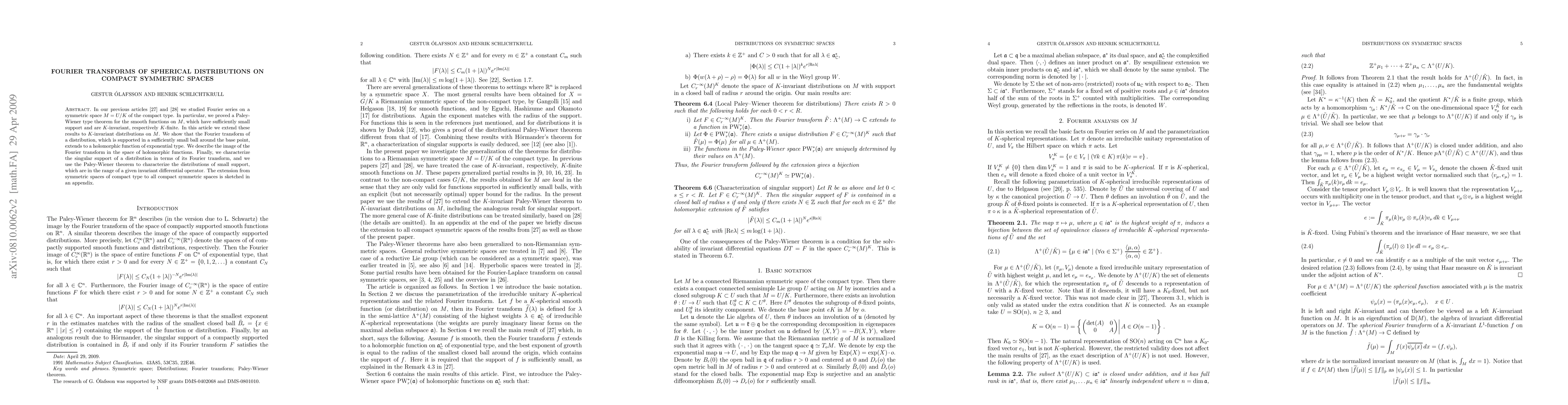 In our previous articles "A local Paley-Wiener theorem for compact symmetric spaces", Adv. Math. 218 (2008), 202--215, and "Fourier series on compact symmetric spaces" (submitted) we studied Fourier series on a compact symmetric space M=U/K. In particular, we proved a Paley-Wiener type theorem for the smooth functions on M, which have sufficiently small support and are K-invariant, respectively K-finite. In this article we extend those results to K-invariant distributions on M. We show that the Fourier transform of a distribution, which is supported in a sufficiently small ball around the base point, extends to a holomorphic function of exponential type. We describe the image of the Fourier transform in the space of holomorphic functions. We characterize the singular support of a distribution in terms of its Fourier transform. Finally, we use the Paley-Wiener theorem to characterize the distributions of small support, which are in the range of a given invariant differential operator.