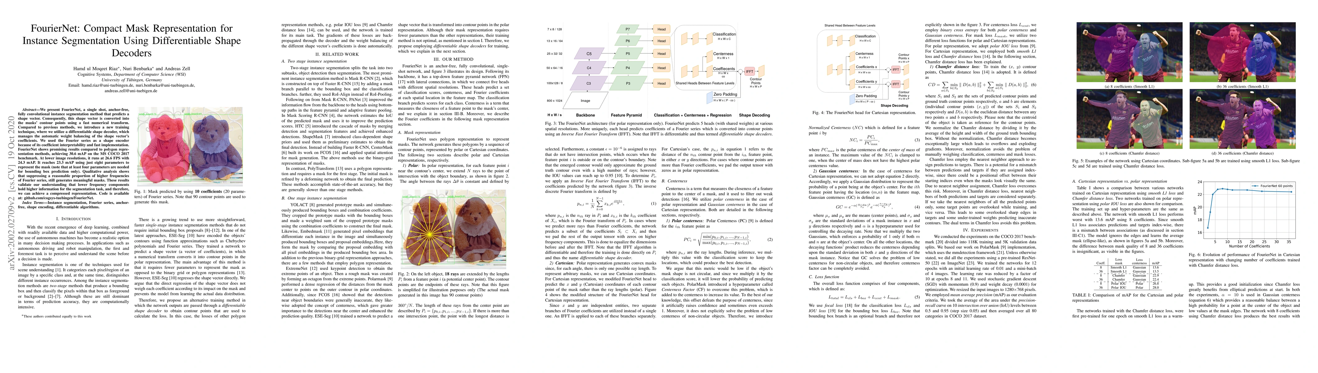 FourierNet introduces a novel, compact mask representation for instance segmentation using differentiable shape decoders and a Fourier series for shape encoding, achieving high accuracy and efficiency on the MS COCO 2017 benchmark while maintaining interpretability and fast implementation. The method demonstrates promising results with minimal parameters, highlighting the effectiveness of lower frequency components for segmentation tasks.