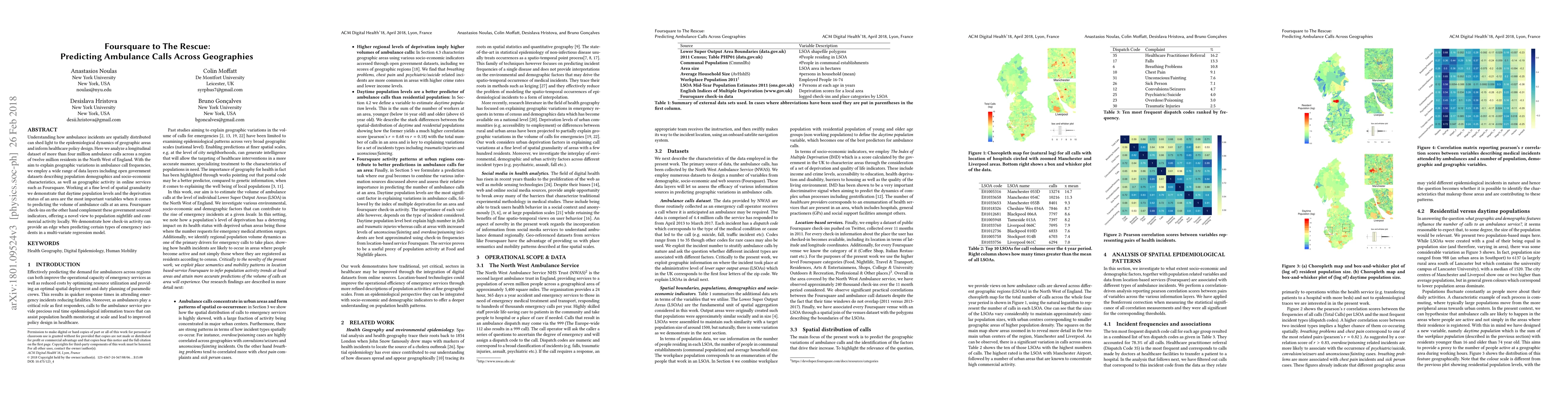 This study uses ambulance call data and Foursquare check-in activity to predict ambulance calls across different geographies, highlighting the importance of daytime population levels and deprivation status in emergency incident prediction.