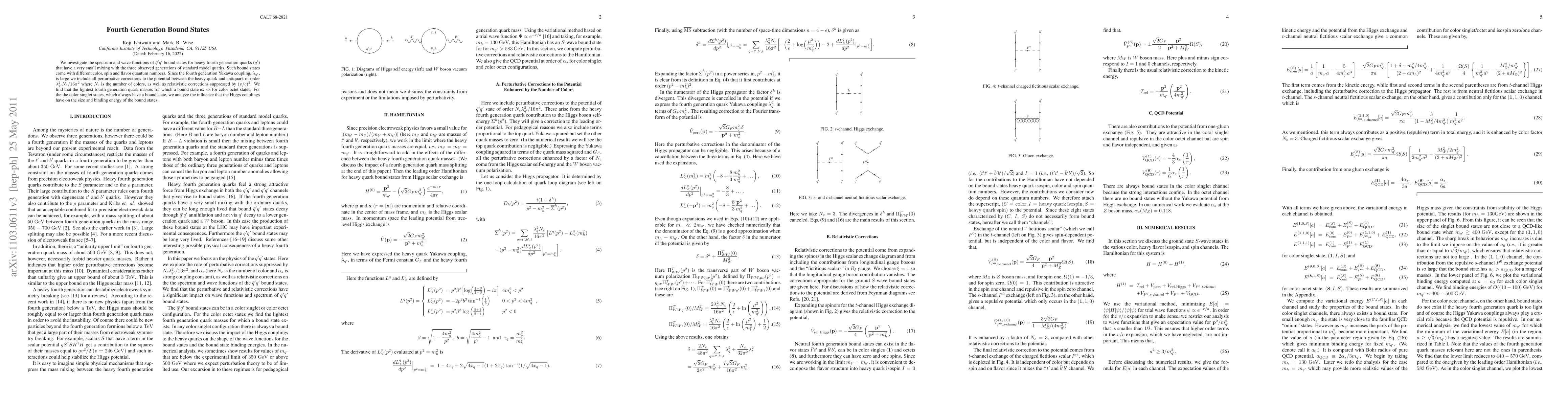 We investigate the spectrum and wave functions of {\bar q}'q' bound states for heavy fourth generation quarks (q') that have a very small mixing with the three observed generations of standard model quarks. Such bound states come with different color, spin and flavor quantum numbers. Since the fourth generation Yukawa coupling, \lambda_{q'}, is large we include all perturbative corrections to the potential between the heavy quark and antiquark of order \lambda_{q'}^2N_c/16\pi^2 where N_c is the number of colors, as well as relativistic corrections suppressed by (v/c)^2. We find that the lightest fourth generation quark masses for which a bound state exists for color octet states. For the the color singlet states, which always have a bound state, we analyze the influence that the Higgs couplings have on the size and binding energy of the bound states.