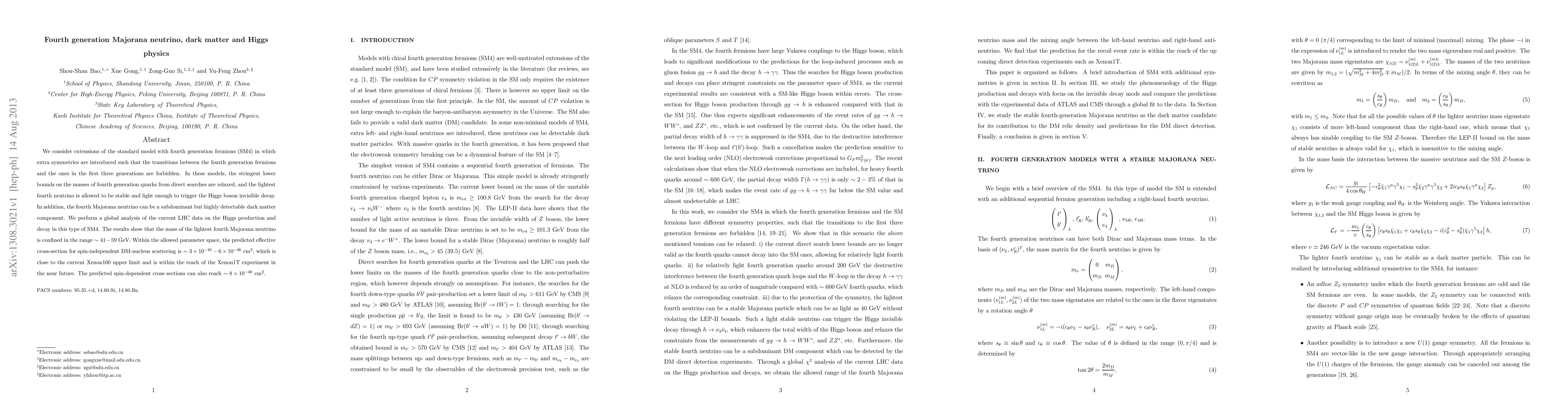 This paper explores extensions of the Standard Model with fourth-generation fermions, proposing that the lightest fourth-generation Majorana neutrino could be stable and trigger Higgs invisible decay. It finds that the mass of this neutrino is likely in the range of 41-59 GeV and is a detectable dark matter component, potentially within the sensitivity of future Xenon1T experiments.