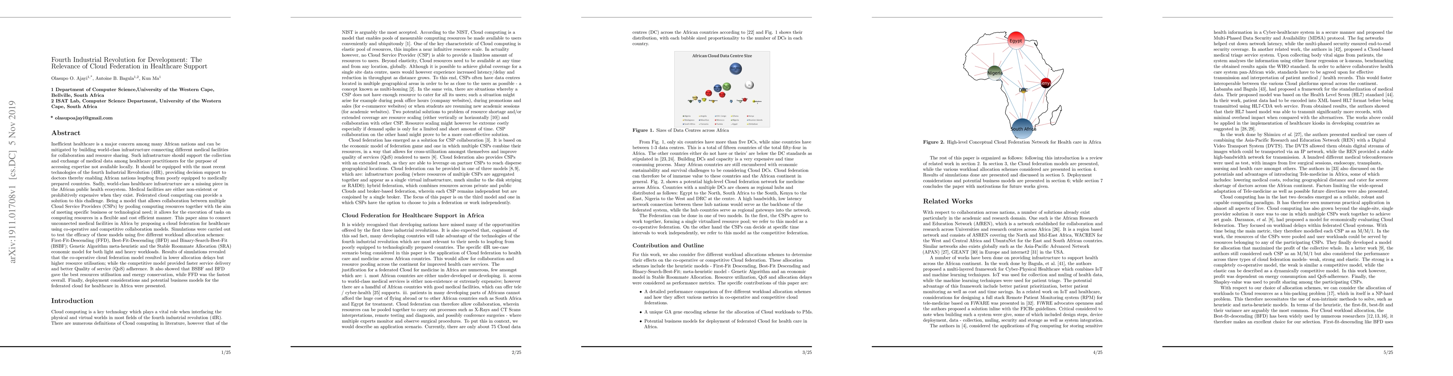 Inefficient healthcare is a major concern among many African nations and can be mitigated by building world-class infrastructure connecting different medical facilities for collaboration and resource sharing. Such infrastructure should support collection and exchange of medical data for the purpose of accessing expertise not available locally. It should be equipped with modern technologies of the fourth industrial revolution, providing decision support to doctors thereby enabling African nations leapfrog from poorly equipped to medically prepared. Sadly, world-class healthcare infrastructure are a missing piece in the African public health ecosystem. Medical facilities are either non-existent or prohibitively expensive when they exist. Federated cloud computing can provide a solution to this challenge. Being a model that allows collaboration between multiple Cloud service providers through resources pooling; it allows for the execution of tasks on computing resources flexibly and cost efficiently. This paper aims to connect unconnected medical facilities in Africa by proposing a Cloud federation for healthcare using cooperative and competitive collaboration models. Simulations were carried out to test the efficacy of these models using five different workload allocation schemes: First-Fit-Descending (FFD), Best-Fit-Descending (BFD), Binary-Search-Best-Fit (BSBF); Genetic Algorithm meta-heuristic and Stable Roommate Allocation economic model for both light and heavy workloads. Results of simulations revealed that the cooperative model resulted in lower delays but higher resource utilisation; while the competitive provided faster service delivery and better quality of service. BSBF and BFD resulted in the best resources utilisation and energy conservation. Finally, deployment considerations and potential business models for federated Cloud for African healthcare were presented.