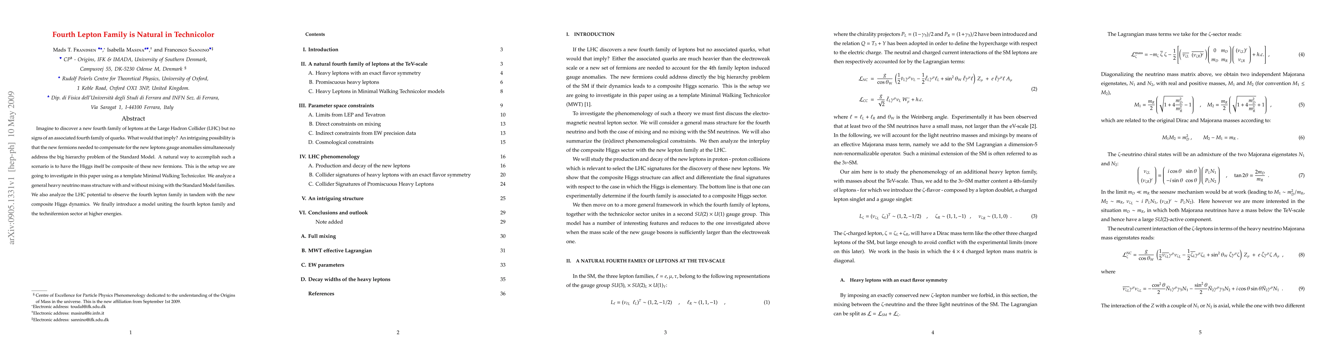 Imagine to discover a new fourth family of leptons at the Large Hadron Collider (LHC) but no signs of an associated fourth family of quarks. What would that imply? An intriguing possibility is that the new fermions needed to compensate for the new leptons gauge anomalies simultaneously address the big hierarchy problem of the Standard Model. A natural way to accomplish such a scenario is to have the Higgs itself be composite of these new fermions. This is the setup we are going to investigate in this paper using as a template Minimal Walking Technicolor. We analyze a general heavy neutrino mass structure with and without mixing with the Standard Model families. We also analyze the LHC potential to observe the fourth lepton family in tandem with the new composite Higgs dynamics. We finally introduce a model uniting the fourth lepton family and the technifermion sector at higher energies.