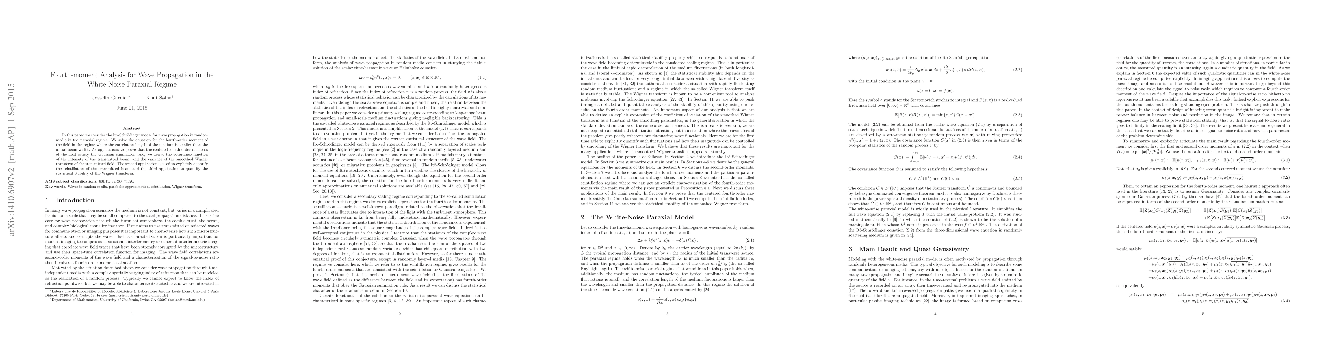 In this paper we consider the Ito-Schrodinger model for wave propagation in random media in the paraxial regime. We solve the equation for the fourth-order moment of the field in the regime where the correlation length of the medium is smaller than the initial beam width. As applications we prove that the centered fourth-order moments of the field satisfy the Gaussian summation rule, we derive the covariance function of the intensity of the transmitted beam, and the variance of the smoothed Wigner transform of the transmitted field. The second application is used to explicitly quantify the scintillation of the transmitted beam and the third application to quantify the statistical stability of the Wigner transform.