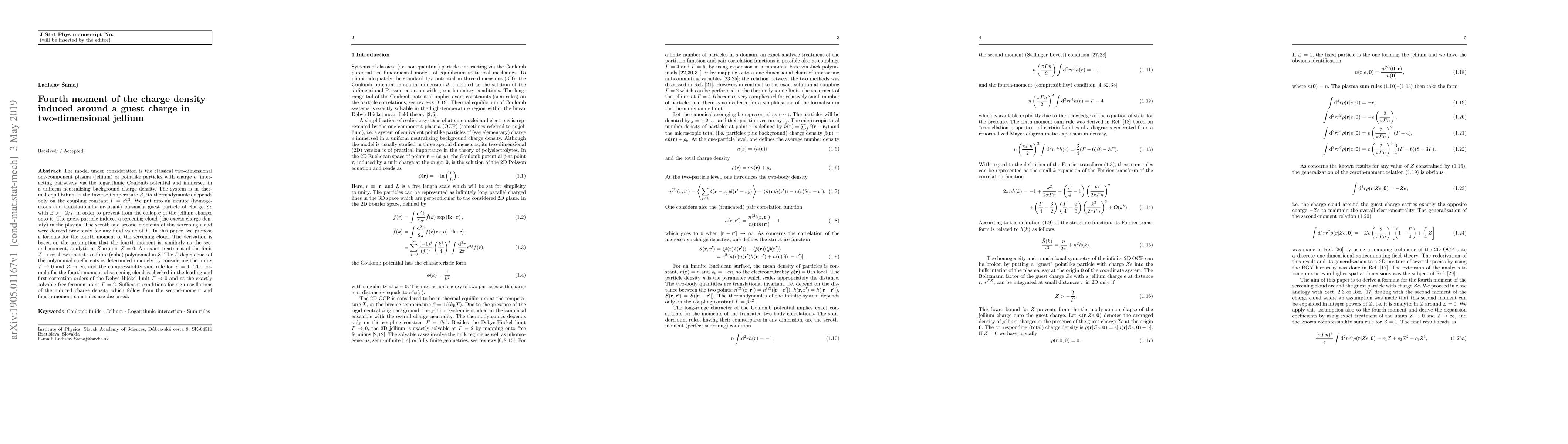 The model under consideration is the classical two-dimensional one-component plasma (jellium) of pointlike particles with charge $e$, interacting pairwisely via the logarithmic Coulomb potential and immersed in a uniform neutralizing background charge density. The system is in thermal equilibrium at the inverse temperature $\beta$, its thermodynamics depends only on the coupling constant $\Gamma=\beta e^2$. We put into an infinite (homogeneous and translationally invariant) plasma a guest particle of charge $Ze$ with $Z>-2/\Gamma$ in order to prevent from the collapse of the jellium charges onto it. The guest particle induces a screening cloud (the excess charge density) in the plasma. The zeroth and second moments of this screening cloud were derived previously for any fluid value of $\Gamma$. In this paper, we propose a formula for the fourth moment of the screening cloud. The derivation is based on the assumption that the fourth moment is, similarly as the second moment, analytic in $Z$ around $Z=0$. An exact treatment of the limit $Z\to\infty$ shows that it is a finite (cube) polynomial in $Z$. The $\Gamma$-dependence of the polynomial coefficients is determined uniquely by considering the limits $Z\to 0$ and $Z\to\infty$, and the compressibility sum rule for $Z=1$. The formula for the fourth moment of screening cloud is checked in the leading and first correction orders of the Debye-H\"uckel limit $\Gamma\to 0$ and at the exactly solvable free-fermion point $\Gamma=2$. Sufficient conditions for sign oscillations of the induced charge density which follow from the second-moment and fourth-moment sum rules are discussed.