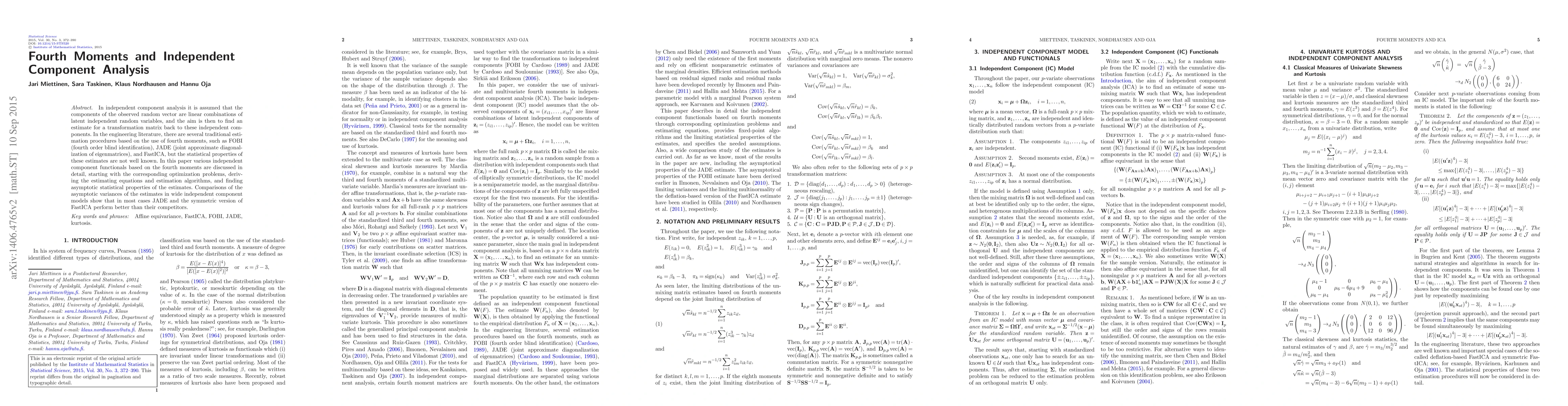 This paper explores independent component analysis (ICA) using fourth moments, detailing various estimation procedures like FOBI, JADE, and FastICA. It derives estimating equations and examines the asymptotic statistical properties, concluding that JADE and symmetric FastICA generally outperform other methods in wide independent component models.