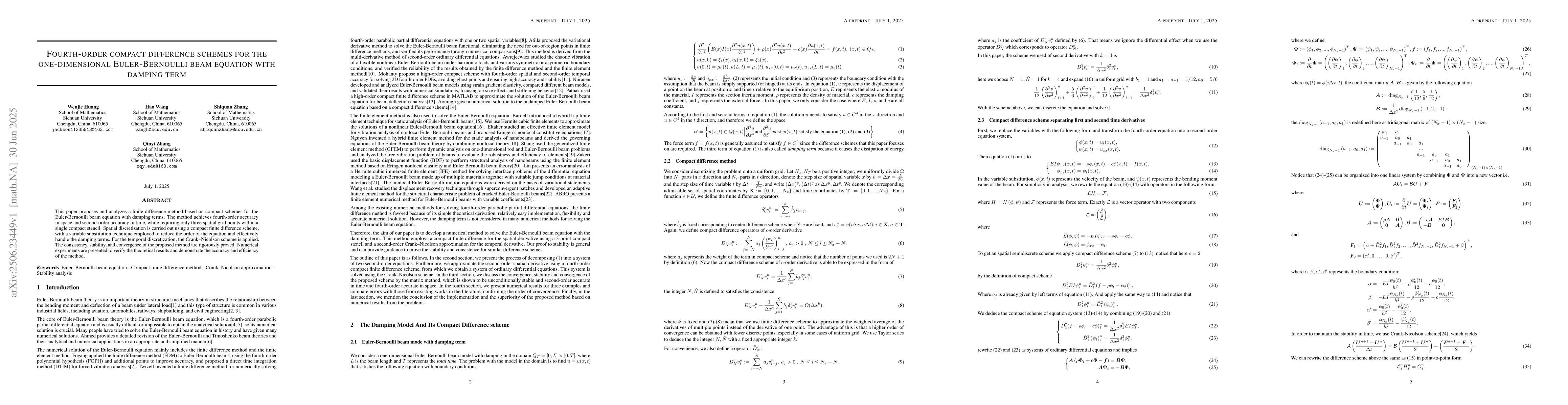 This research introduces a fourth-order accurate, compact finite difference method for solving the Euler-Bernoulli beam equation with damping, using only three spatial grid points and the Crank-Nicolson scheme for time discretization. The method's consistency, stability, and convergence are proven, with numerical experiments validating its accuracy and efficiency.