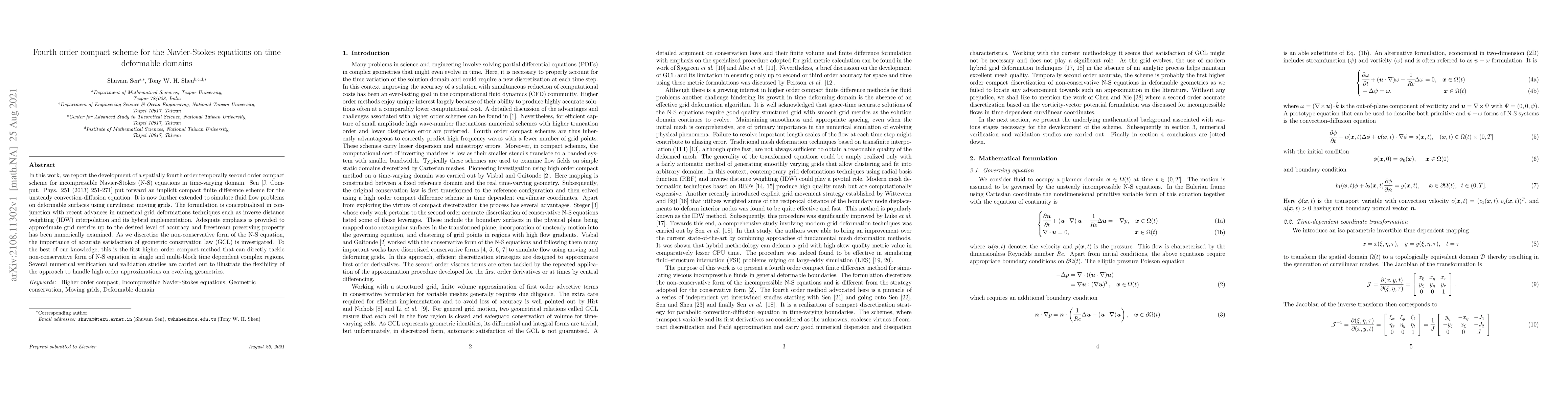This paper develops a fourth-order compact scheme for the incompressible Navier-Stokes equations in time-varying domains, extending Sen's implicit compact finite difference method to deformable surfaces using curvilinear moving grids. The method ensures accurate grid metrics and satisfies the geometric conservation law, demonstrating flexibility in handling high-order approximations on evolving geometries.