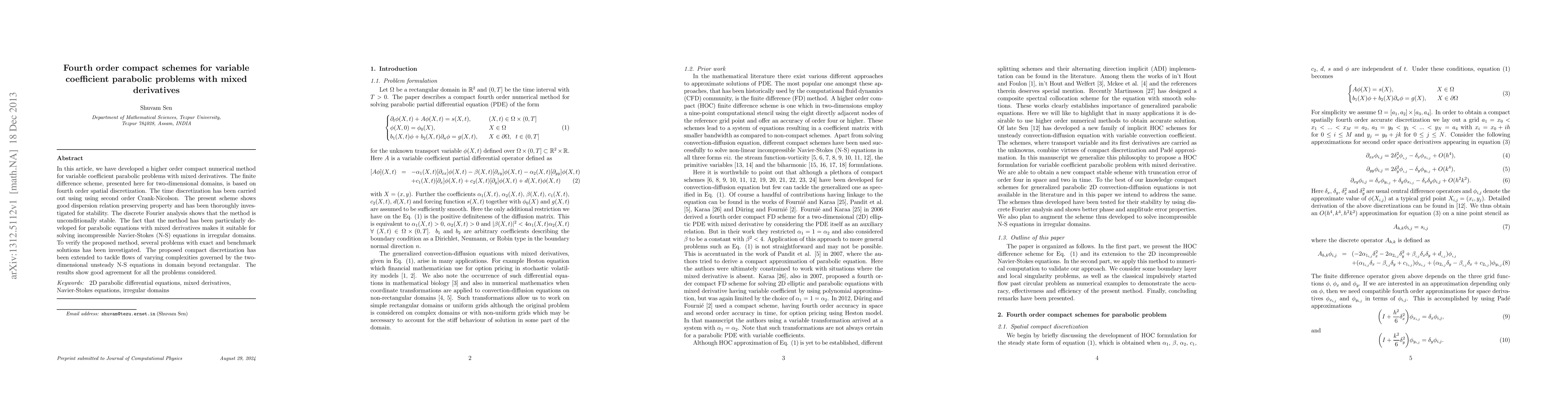 This paper develops a fourth-order compact finite difference scheme for solving variable coefficient parabolic problems with mixed derivatives, employing second-order Crank-Nicolson time discretization. The method is shown to be unconditionally stable and effective for solving incompressible Navier-Stokes equations in irregular domains, with good agreement in benchmark problem results.