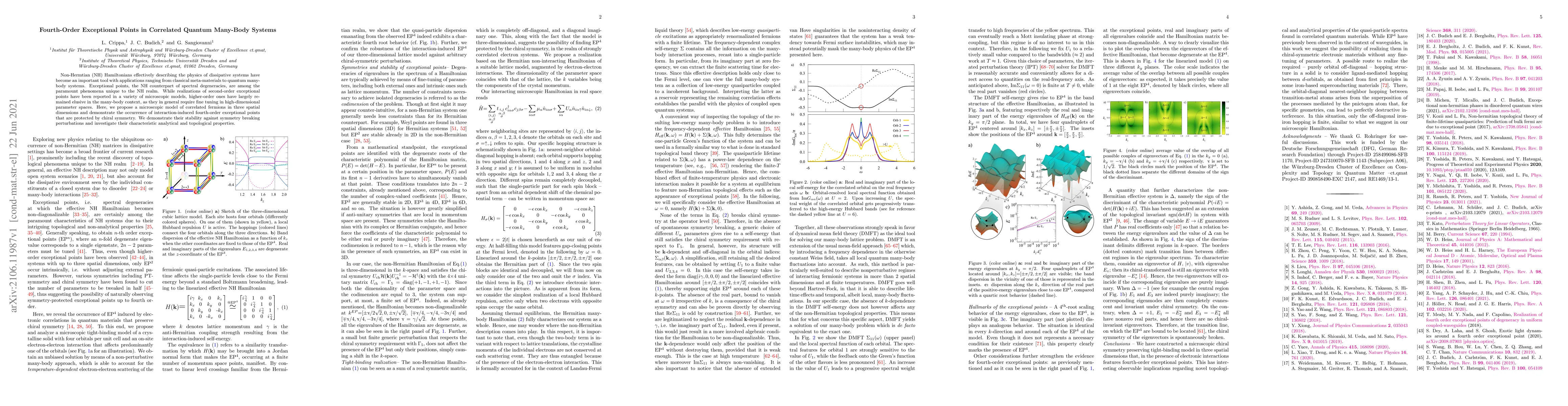 This paper proposes a microscopic model of correlated fermions to demonstrate the existence of fourth-order exceptional points in quantum many-body systems, protected by chiral symmetry. It investigates the stability and unique analytical and topological properties of these points.