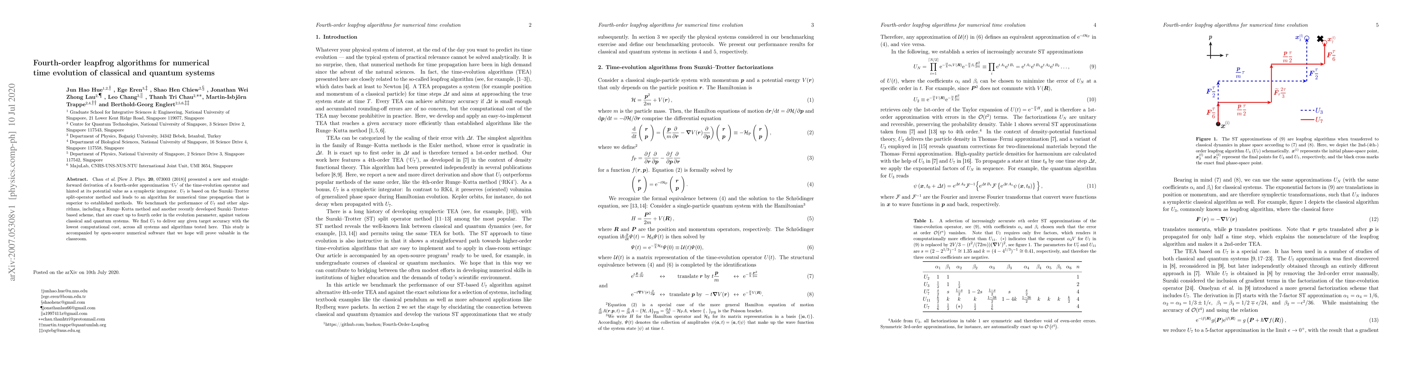 Chau et al. [New J. Phys. 20, 073003 (2018)] presented a new and straight-forward derivation of a fourth-order approximation '$U_7$' of the time-evolution operator and hinted at its potential value as a symplectic integrator. $U_7$ is based on the Suzuki-Trotter split-operator method and leads to an algorithm for numerical time propagation that is superior to established methods. We benchmark the performance of $U_7$ and other algorithms, including a Runge-Kutta method and another recently developed Suzuki-Trotter-based scheme, that are exact up to fourth order in the evolution parameter, against various classical and quantum systems. We find $U_7$ to deliver any given target accuracy with the lowest computational cost, across all systems and algorithms tested here. This study is accompanied by open-source numerical software that we hope will prove valuable in the classroom.