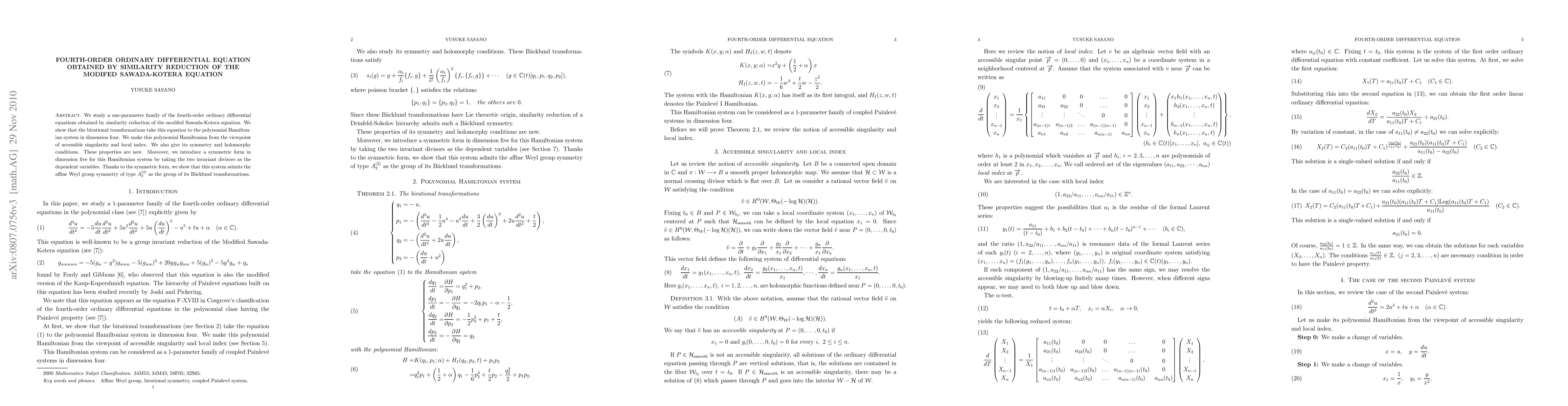 Researchers studied a fourth-order ordinary differential equation derived from the modified Sawada-Kotera equation through similarity reduction, showing it transforms into a polynomial Hamiltonian system with specific symmetry and holomorphy conditions.