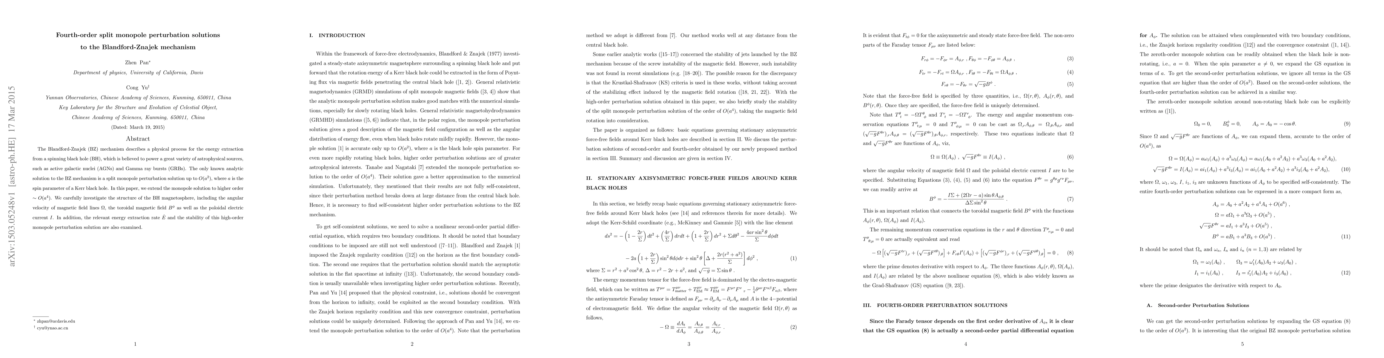 This paper extends the analytic solution of the Blandford-Znajek mechanism to fourth-order perturbation, exploring the structure of the black hole magnetosphere and examining the angular velocity, toroidal magnetic field, and energy extraction rate. The stability of the high-order monopole perturbation solution is also investigated.