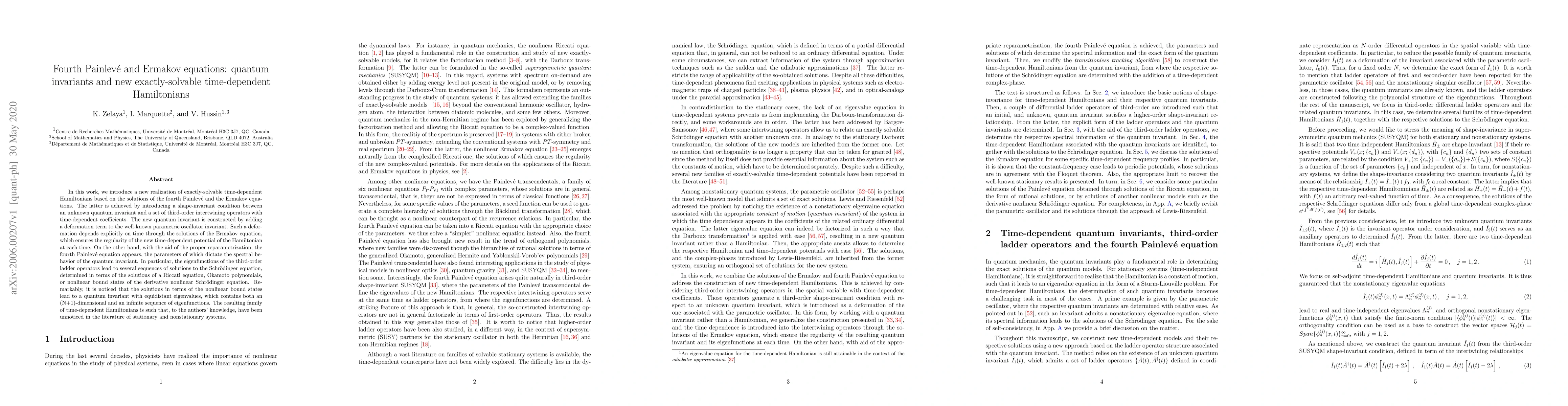 In this work, we introduce a new realization of exactly-solvable time-dependent Hamiltonians based on the solutions of the fourth Painlev\'e and the Ermakov equations. The latter is achieved by introducing a shape-invariant condition between an unknown quantum invariant and a set of third-order intertwining operators with time-dependent coefficients. The new quantum invariant is constructed by adding a deformation term to the well-known parametric oscillator invariant. Such a deformation depends explicitly on time through the solutions of the Ermakov equation, which ensures the regularity of the new time-dependent potential of the Hamiltonian at each time. On the other hand, with the aid of the proper reparametrization, the fourth Painlev\'e equation appears, the parameters of which dictate the spectral behavior of the quantum invariant. In particular, the eigenfunctions of the third-order ladder operators lead to several sequences of solutions to the Schr\"odinger equation, determined in terms of the solutions of a Riccati equation, Okamoto polynomials, or nonlinear bound states of the derivative nonlinear Schr\"odinger equation. Remarkably, it is noticed that the solutions in terms of the nonlinear bound states lead to a quantum invariant with equidistant eigenvalues, which contains both an (N+1)-dimensional and an infinite sequence of eigenfunctions. The resulting family of time-dependent Hamiltonians is such that, to the authors' knowledge, have been unnoticed in the literature of stationary and nonstationary systems.