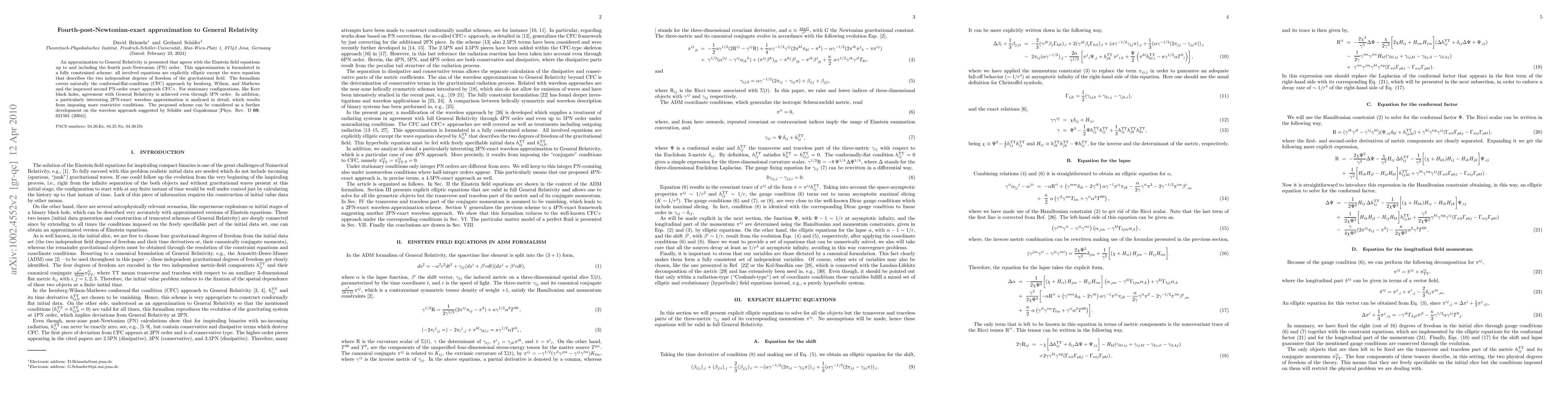 This paper presents a fourth-post-Newtonian (PN) exact approximation to General Relativity, fully constrained and agreeing with Einstein's field equations up to the fourth PN order. The scheme also achieves agreement with General Relativity through the fifth PN order for stationary configurations like Kerr black holes.